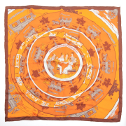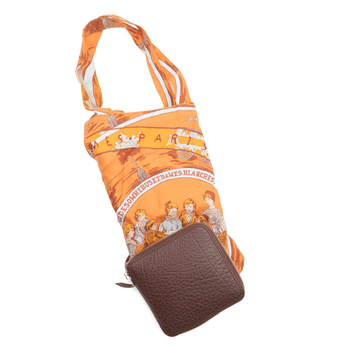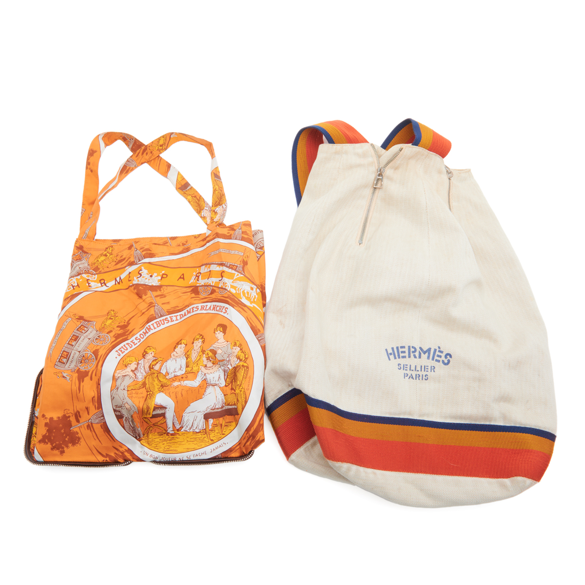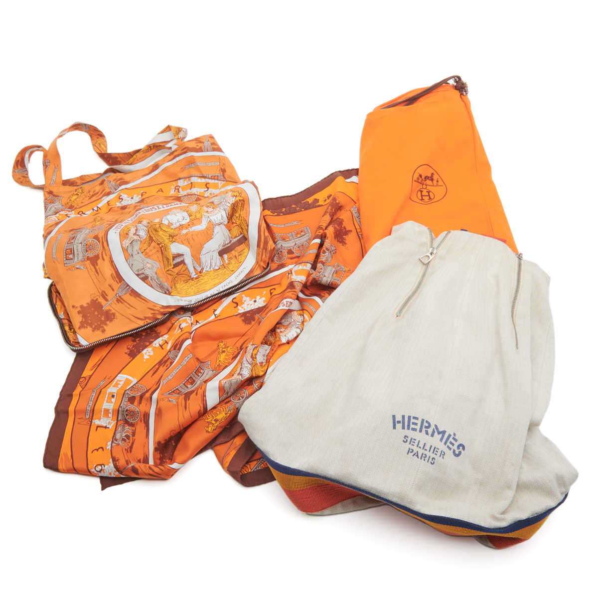 Comprising Omnibus 1937-2007 orange silk scarf with box, matching collapsible tote bag with connected leather case and box, Cavalier sling bag, and open bottom luggage cover.
