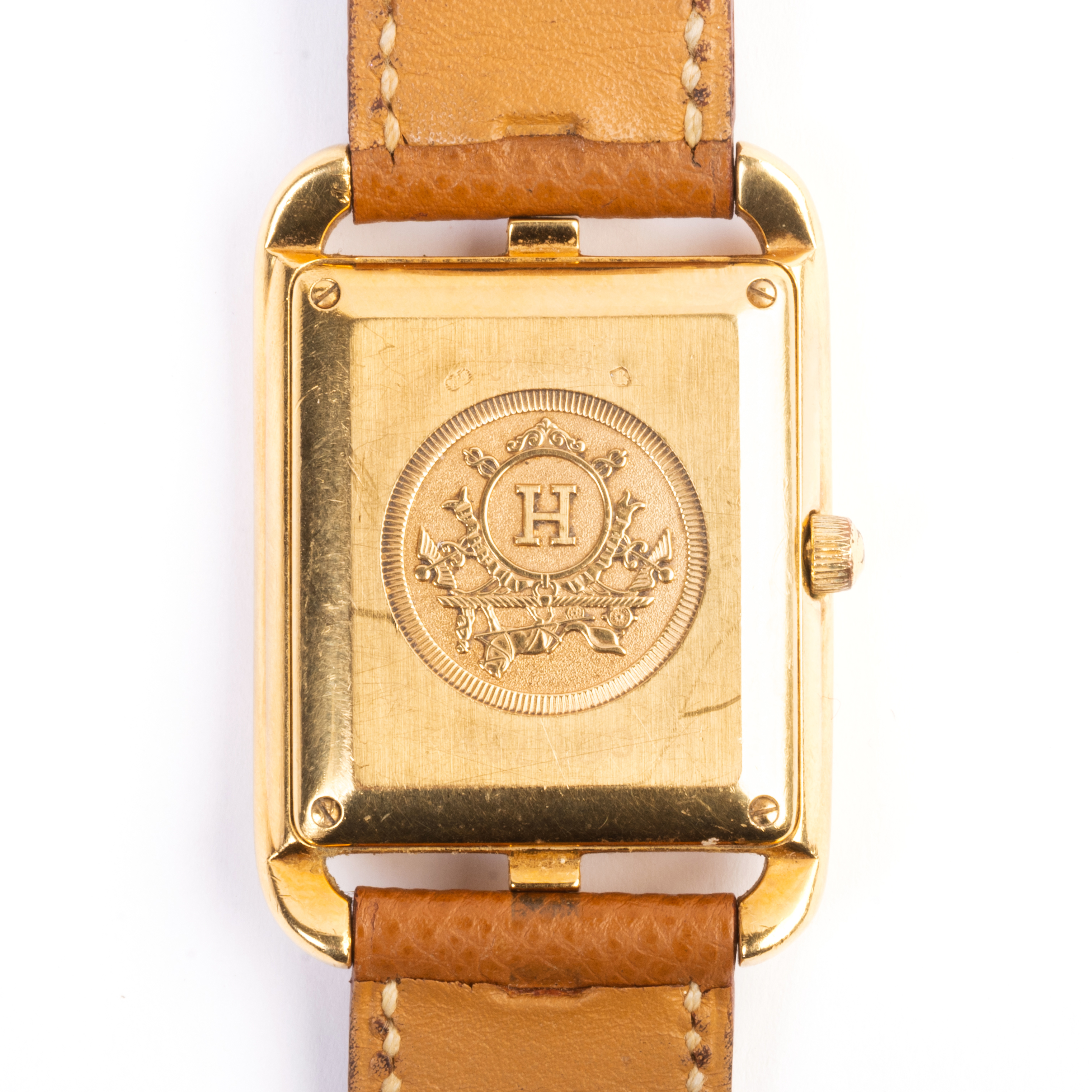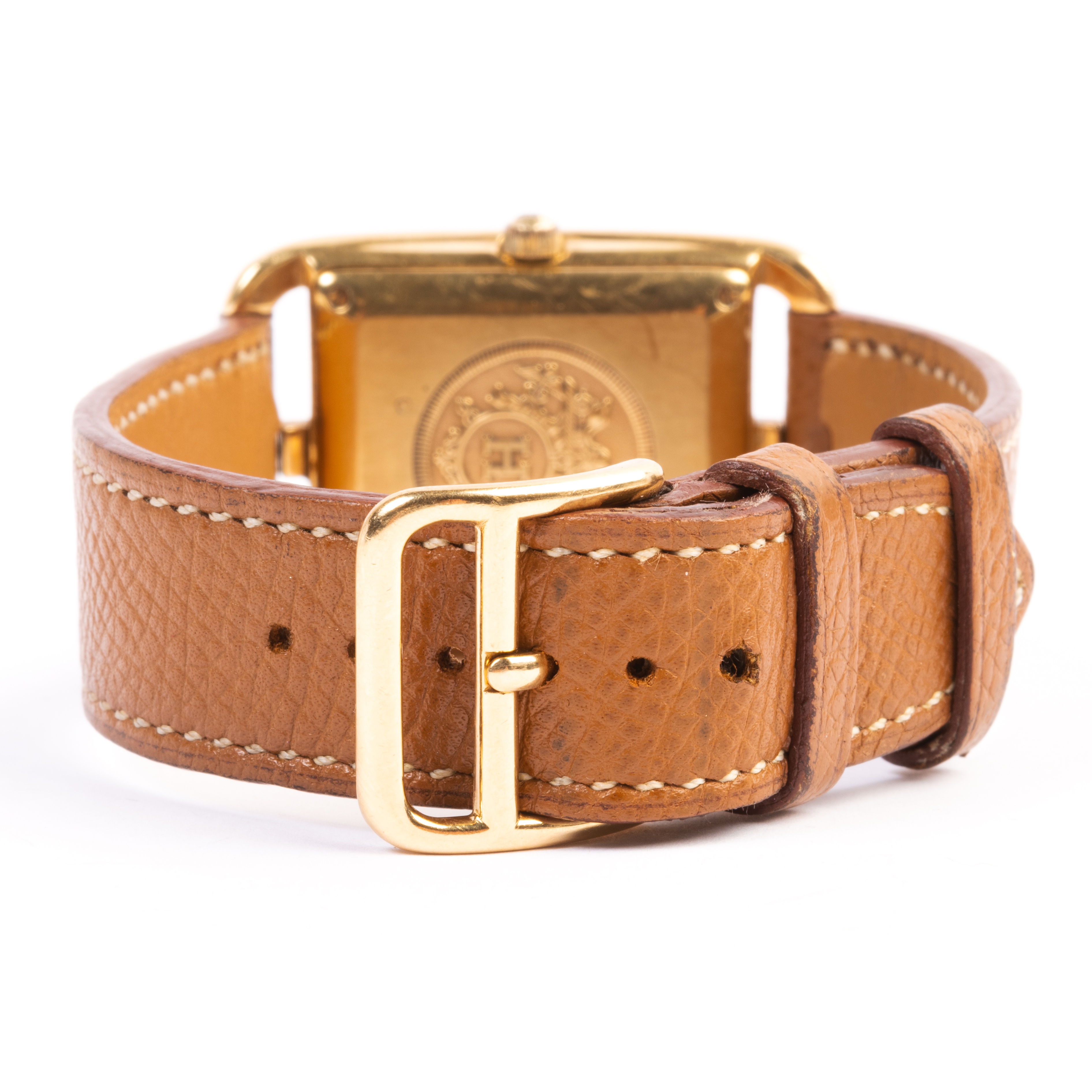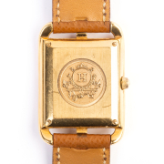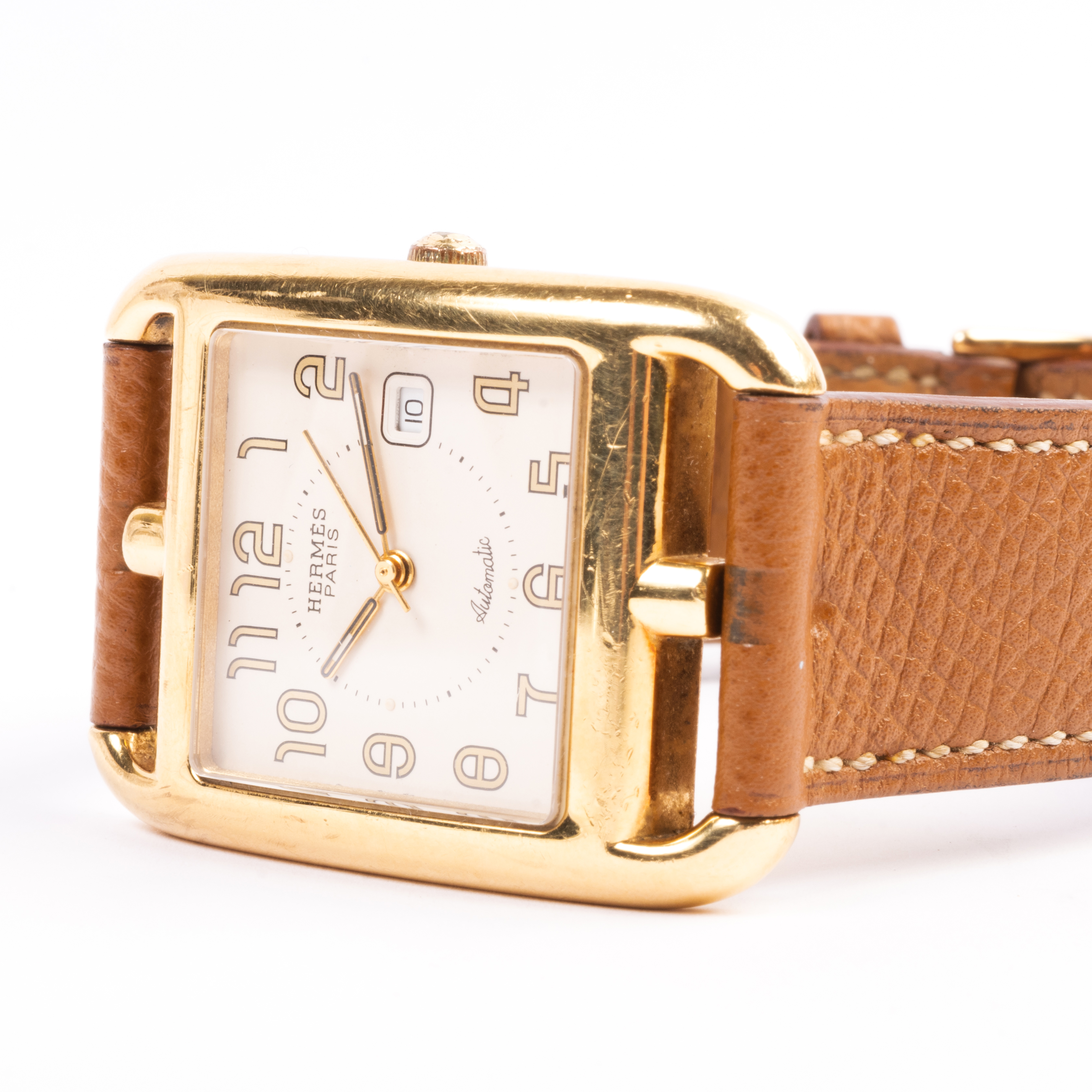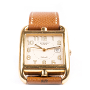 DIAL: Square, cream, stylized gold Arabic hour markers, inner black dot minutes track, aperture for date at 3 oclock, gold center sweep seconds hand, gold and black baton hands, Hermes, Paris, Automatic, Swiss made. MOVEMENT: Automatic (not opened). CASE: Cape Cod/rectangle, 18k yellow gold, four lugs with top and bottom central lip, four screw back (not opened), CC1.785, 835242, 29 X 29 mm. STRAP: Brown leather, 18k yellow gold buckle, 7 to 7 3/4 inches.