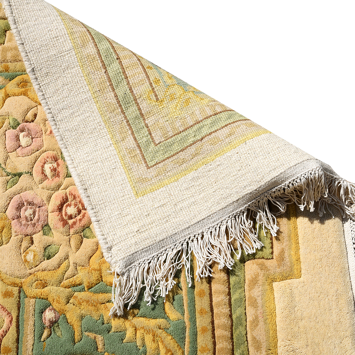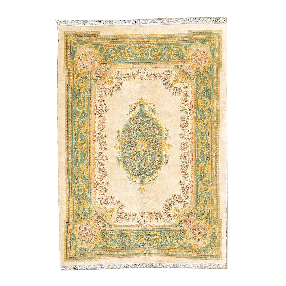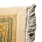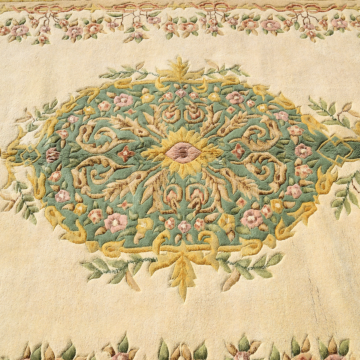 Central green medallion on a cream ground, with a green main border, and foliate decoration throughout.