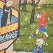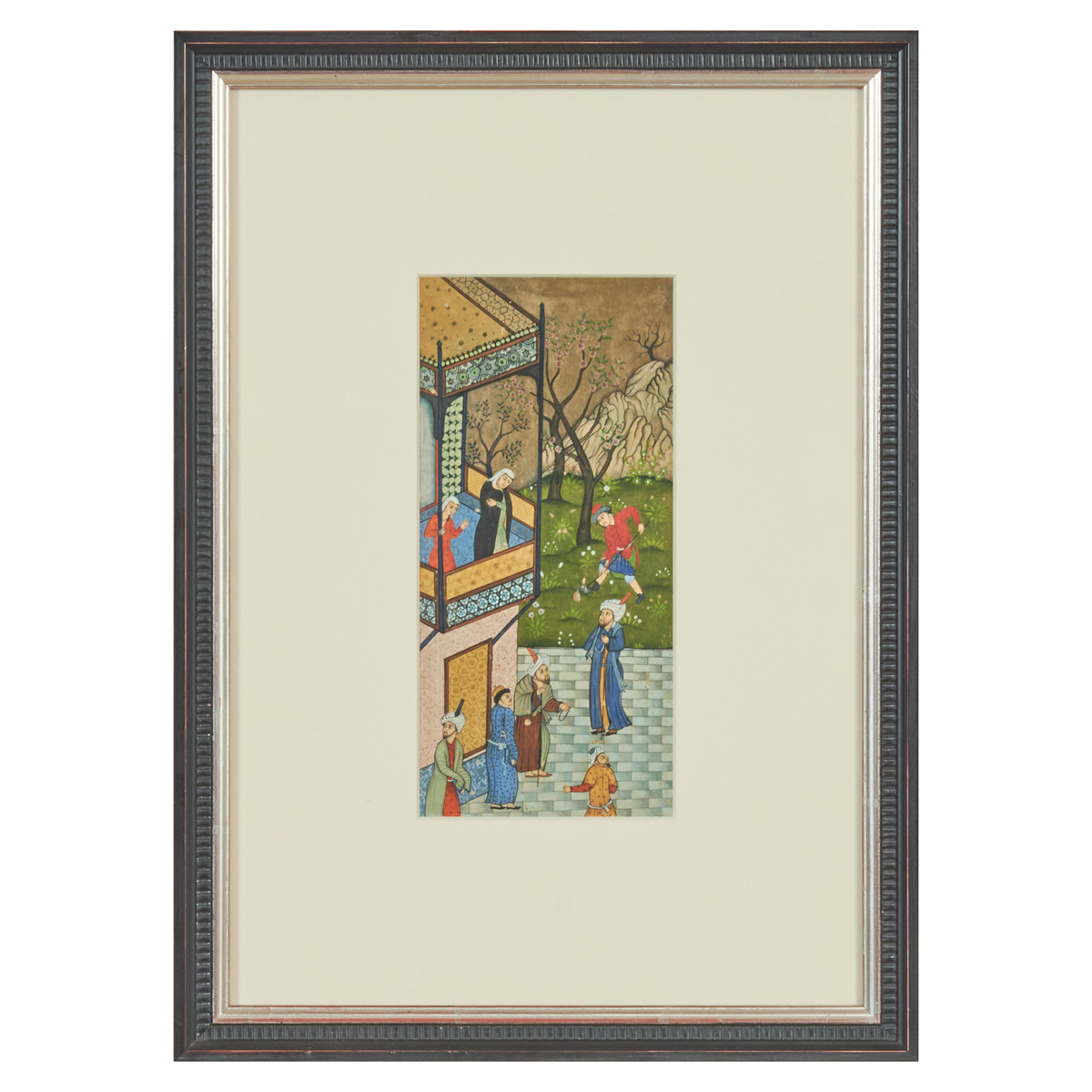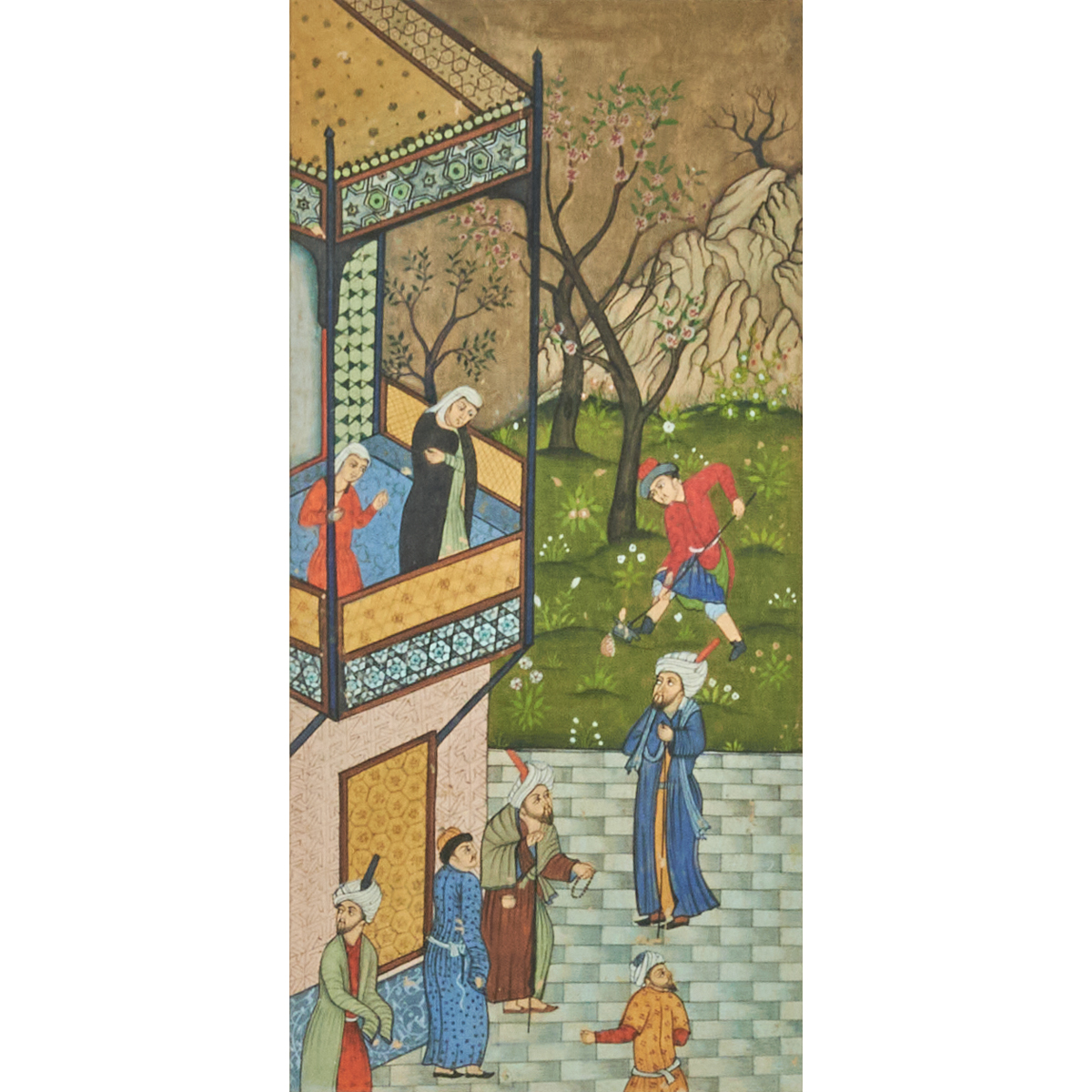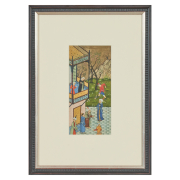 Gouache and ink on paper, framed and glazed. Depicting a balcony scene of two women gazing beneath them as a suitor calls for their attention.