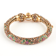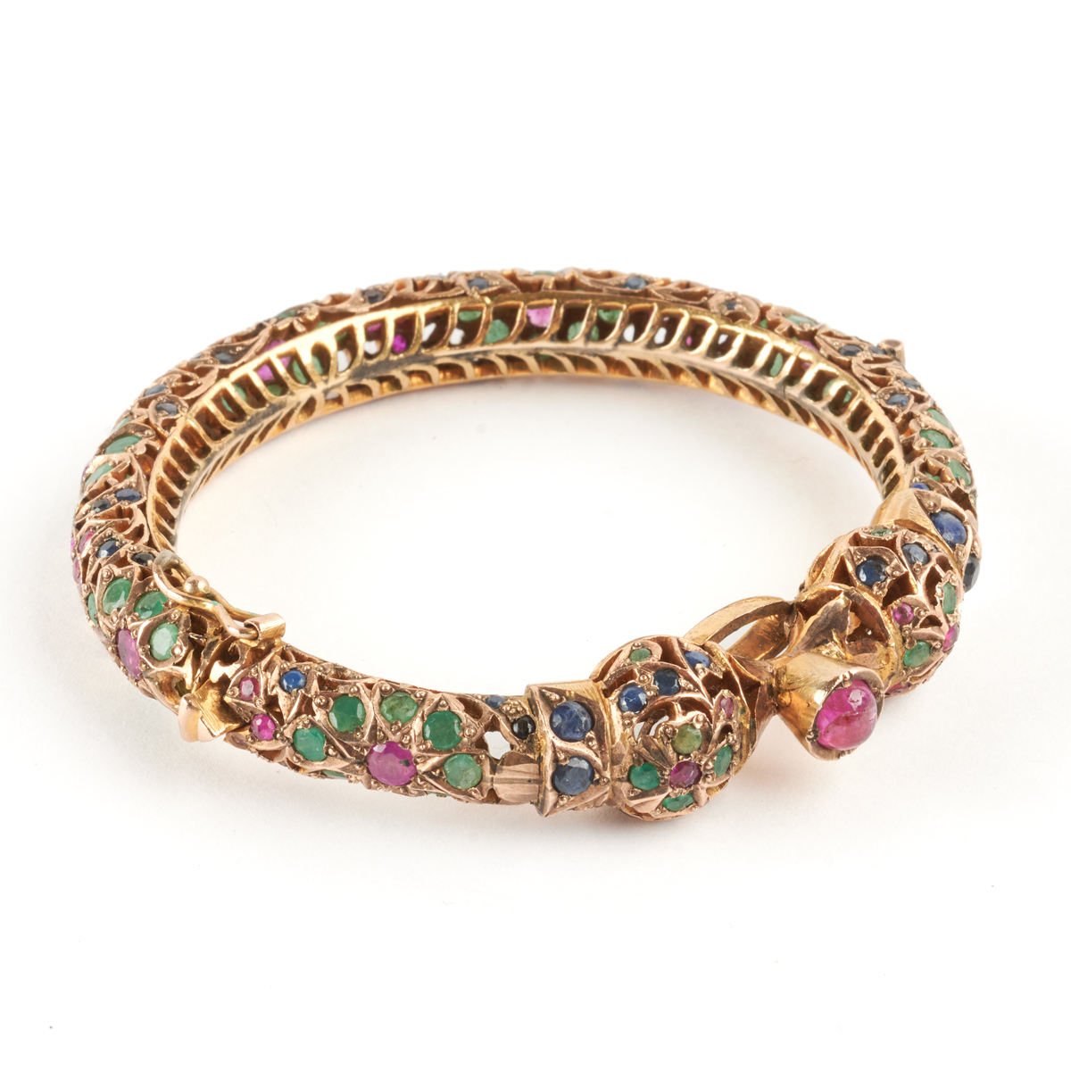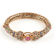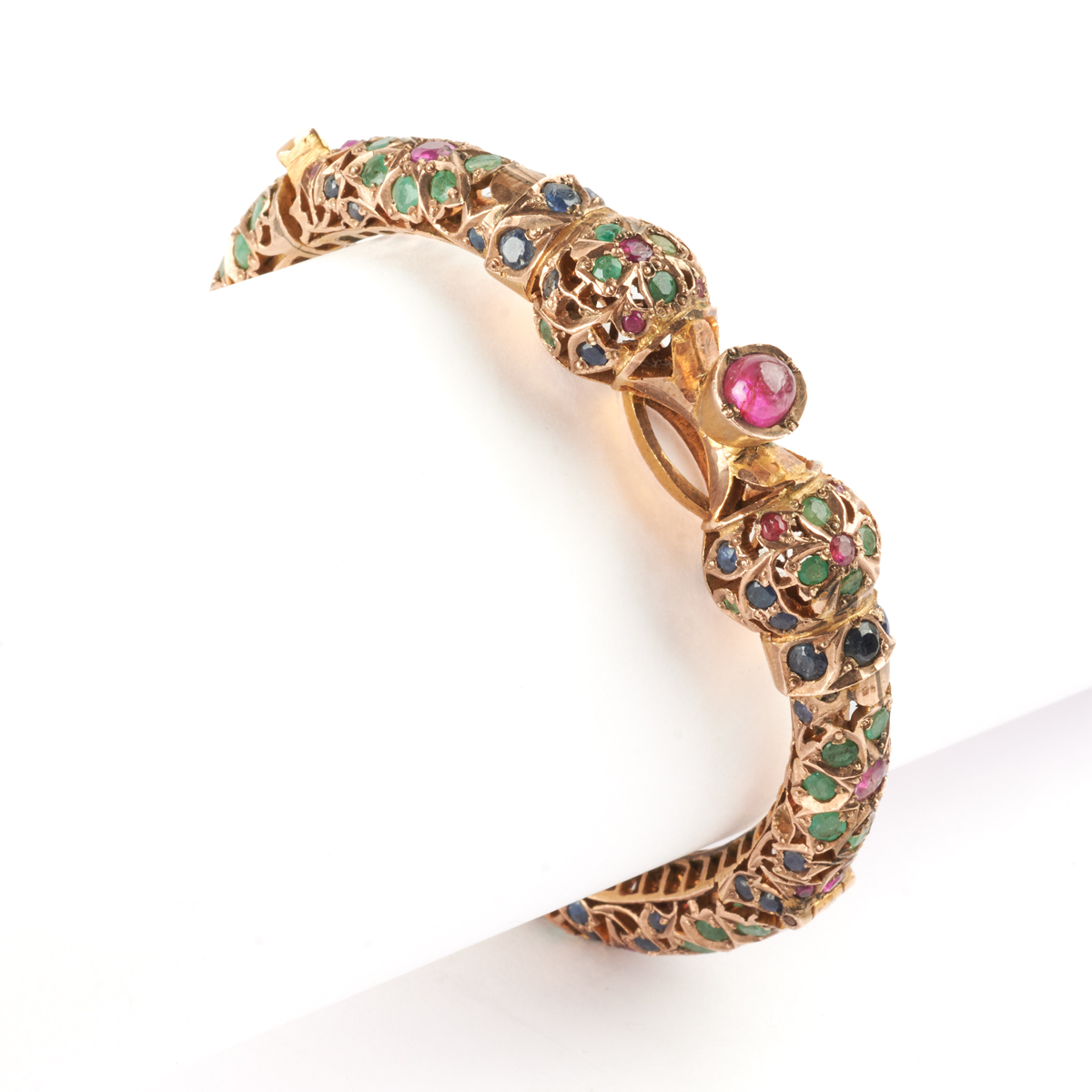Featuring one round shaped ruby cabochon, accented by numerous round-cut rubies, sapphires and emeralds, set in a 9k yellow gold hinged bangle motif mounting measuring approximately 13 mm in width, completed by a tongue and groove clasp with figure eight safety and an internal diameter of approximately 54 mm.