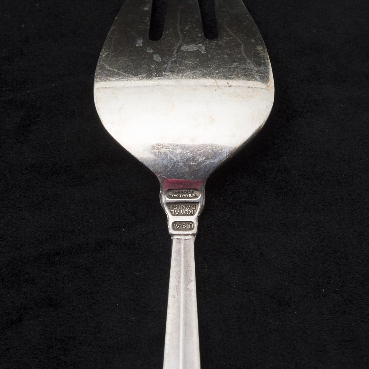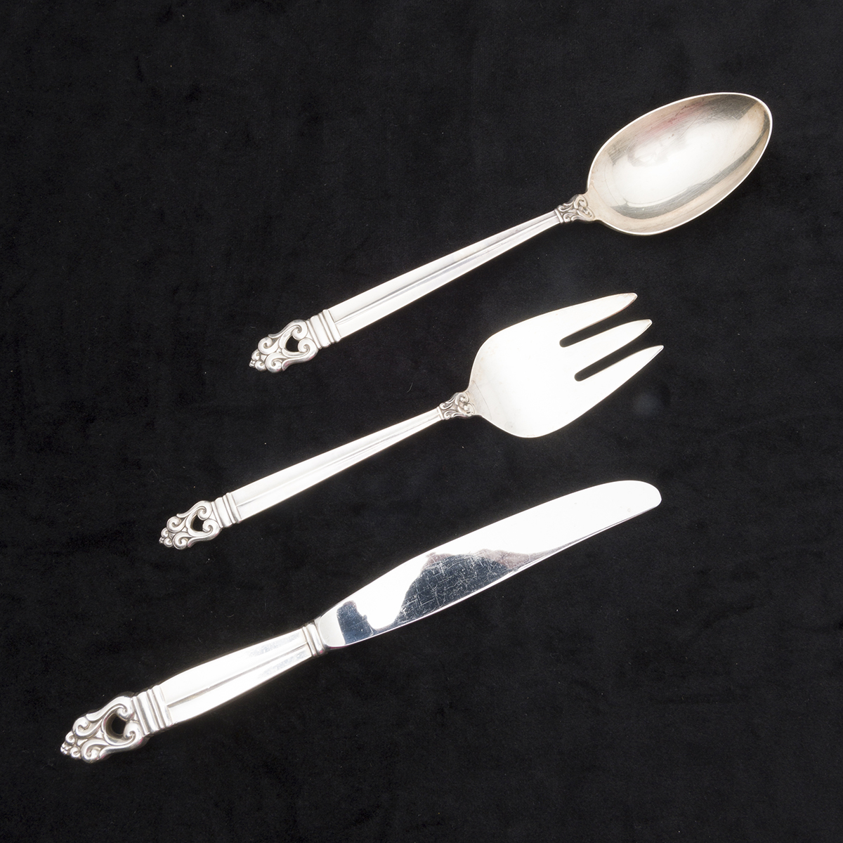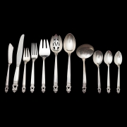 Comprising 8 dinner knives, 8 dinner forks, 8 salad forks, 8 teaspoons, 6 grapefruit spoons, 1 master butter knife, 1 sugar spoon, 1 gravy ladle, 1 tablespoon, 1 pierced tablespoon, 1 serving fork.