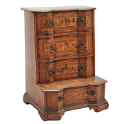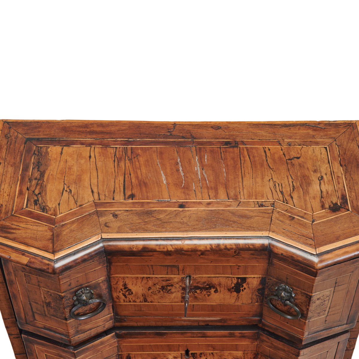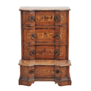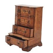 Walnut with burl panels and inlaid banding throughout, three drawers to top section with single drawer to base, later pulls.