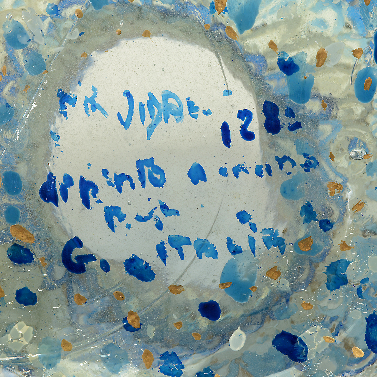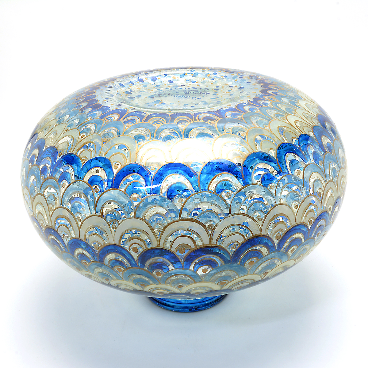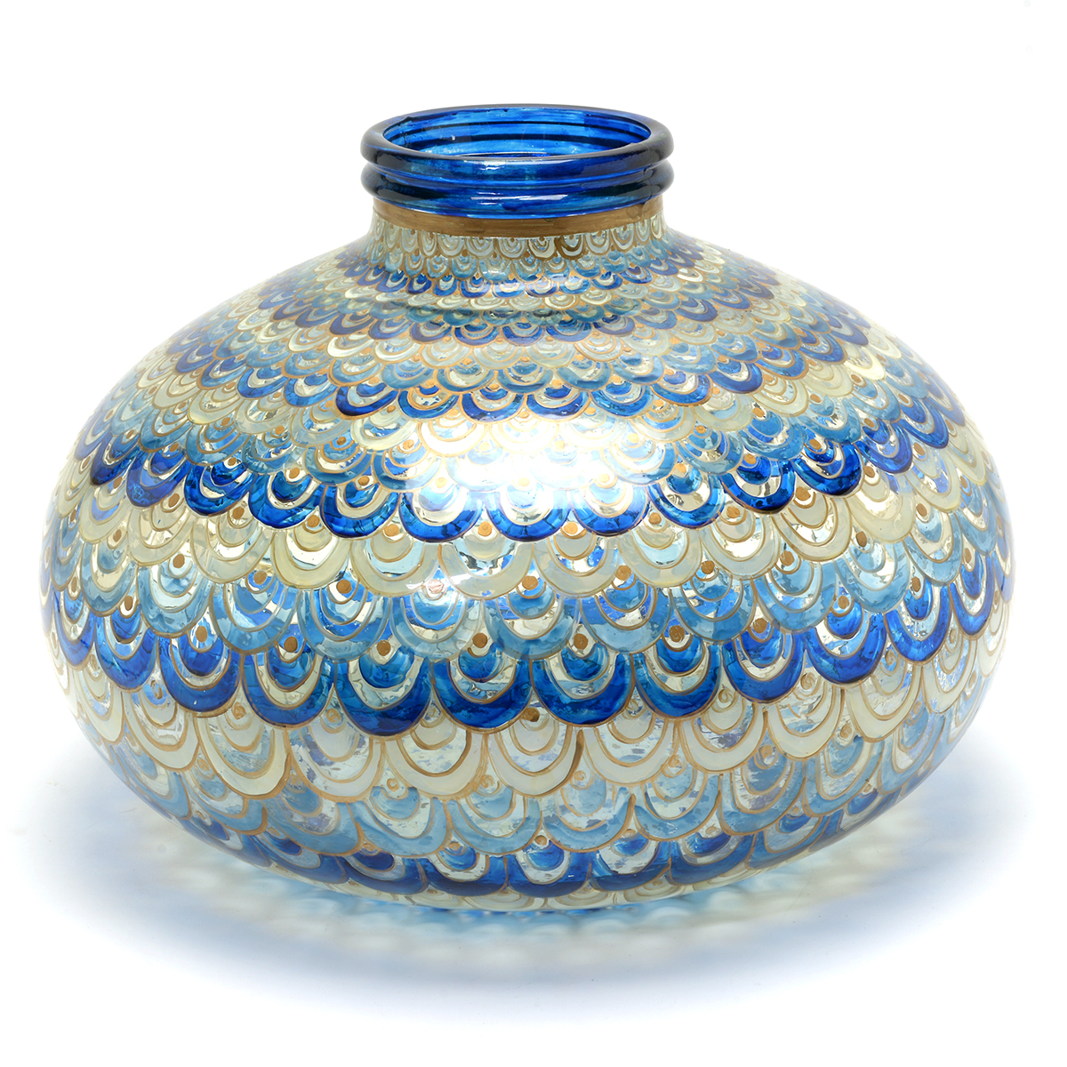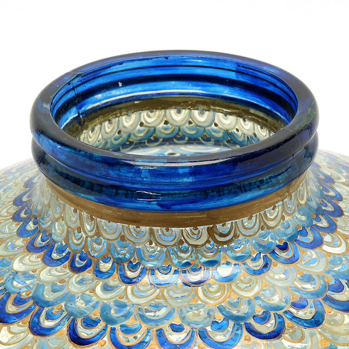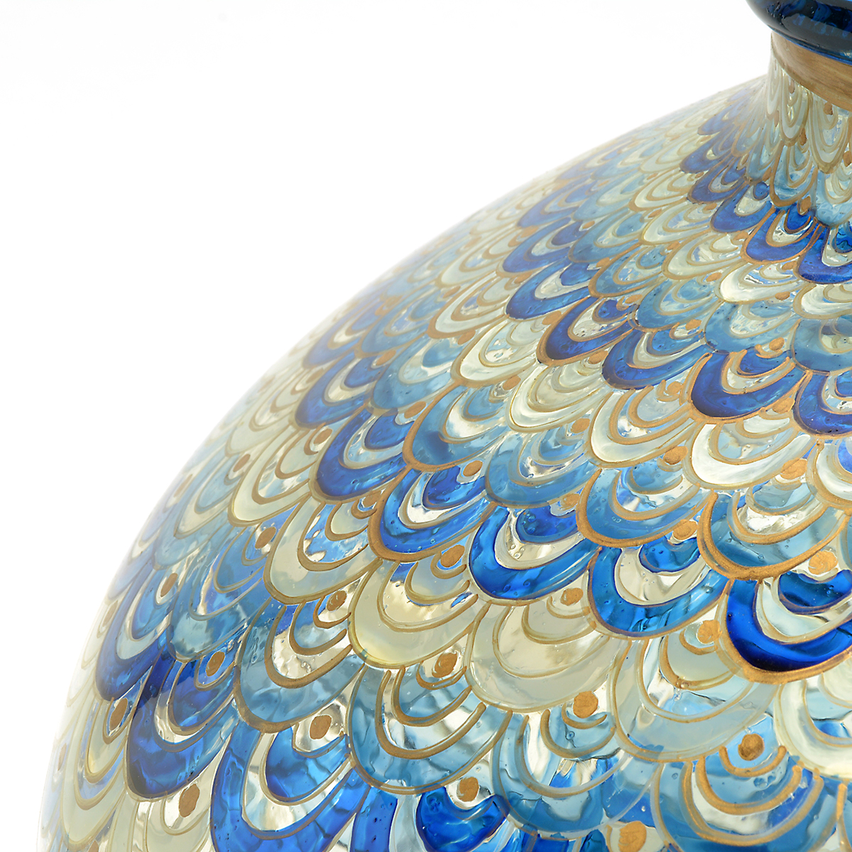 Stepped mouth which tapers into a wide and round body. Clear glass painted with a blue and gilt scale pattern.