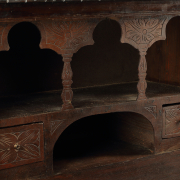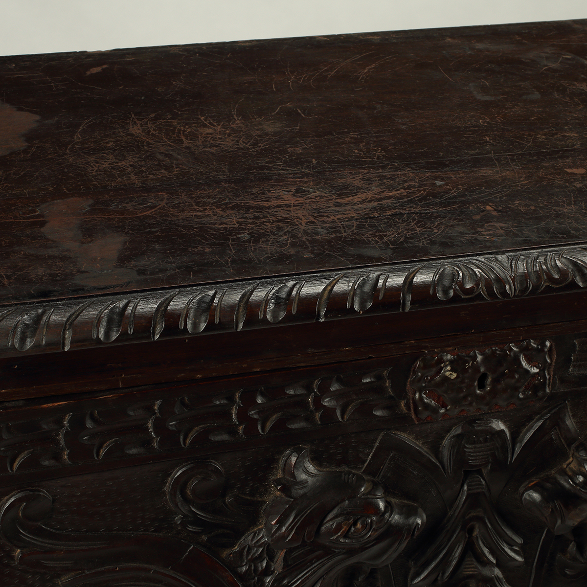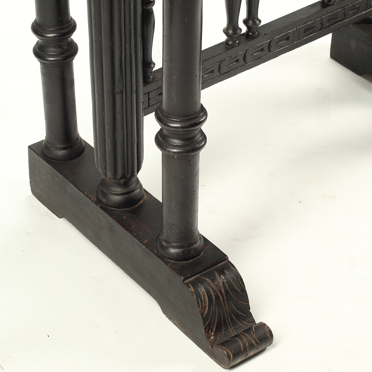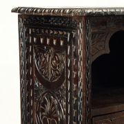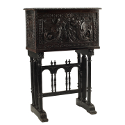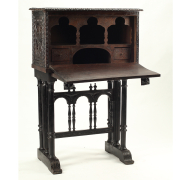 Fall-front top section with carved front and side panels married ebonized base.
