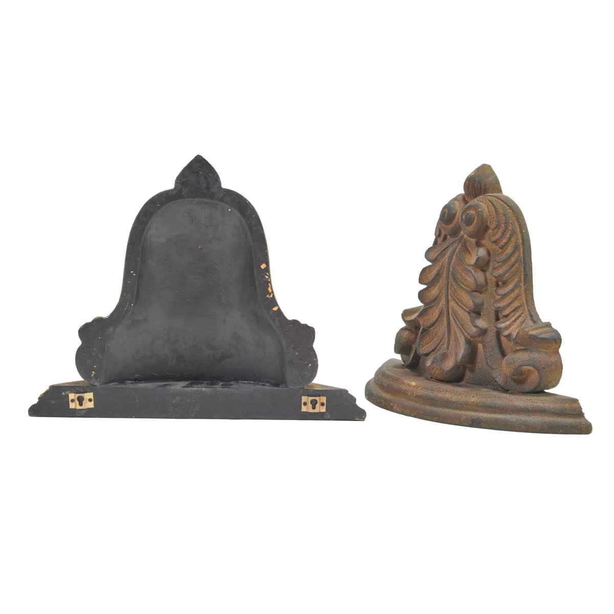 Condition: Tops replaced and added later, the bodies extensively repaired and with new sanded texture to imitate stone. Extensive wear, losses to gilt tone. Minor chips and losses.