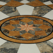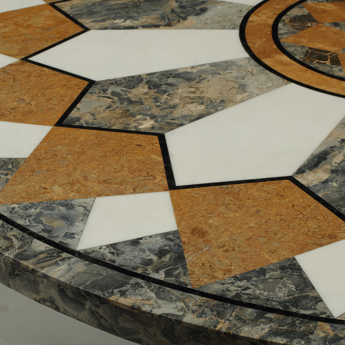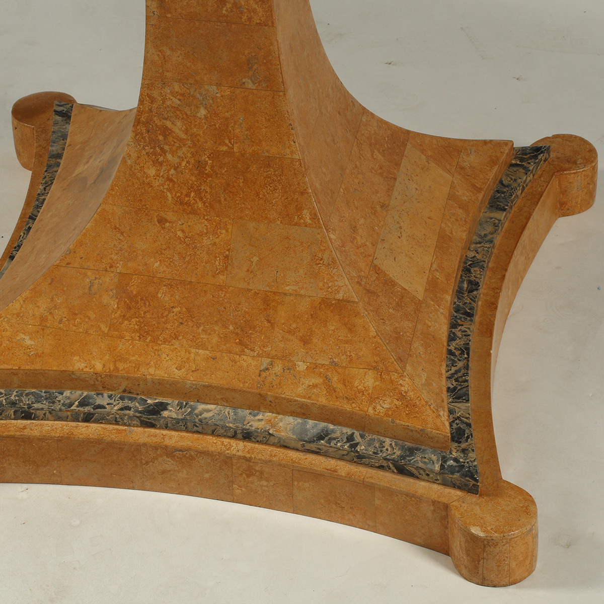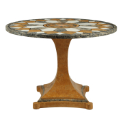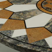 The round top with white, gray, and brown marble on tapered pedestal with stepped square base.