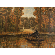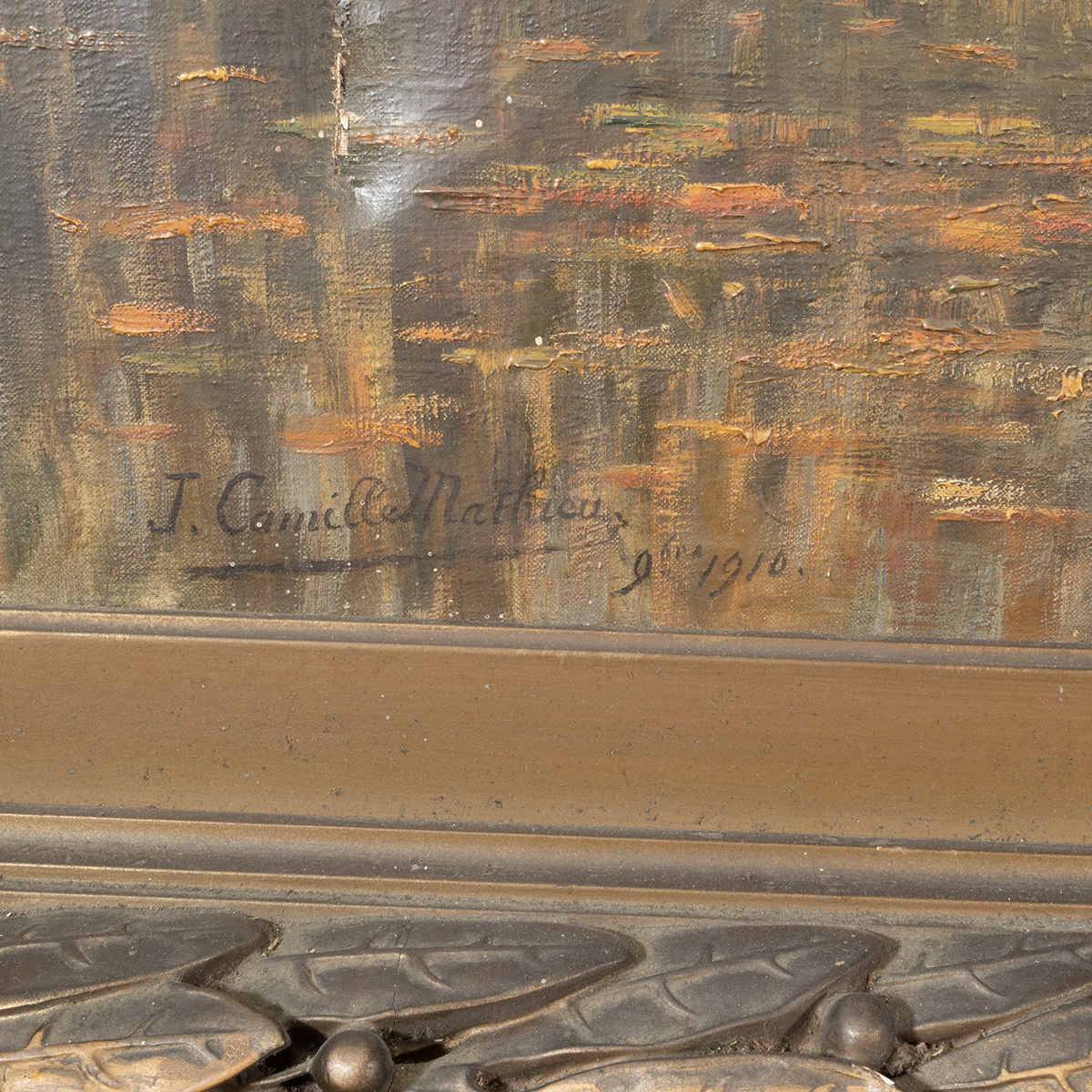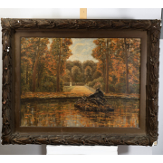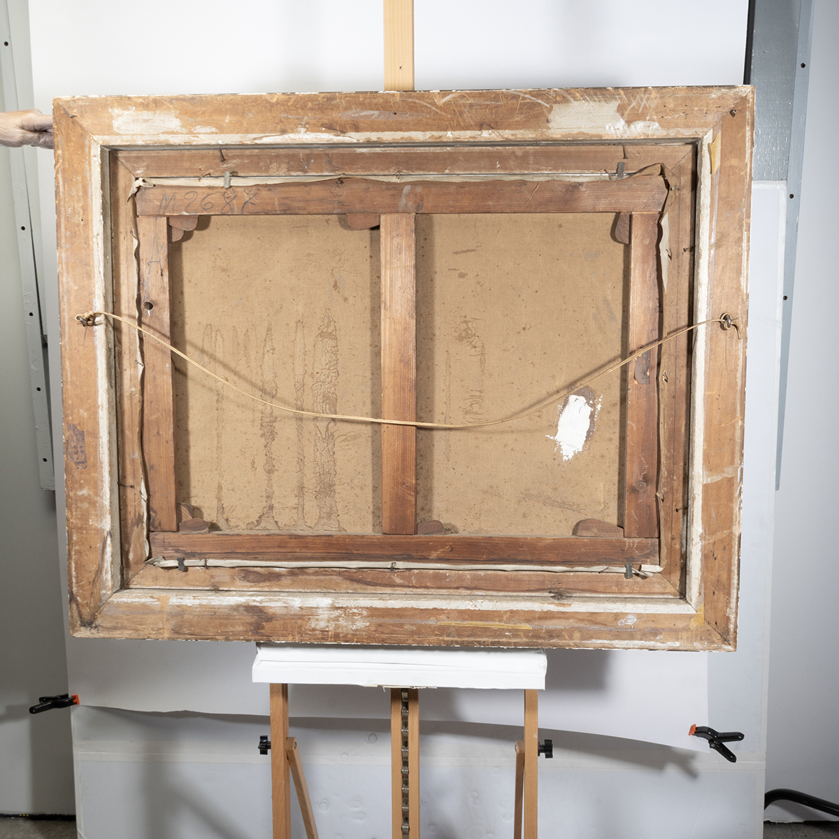 Condition: Surface dirt/dust and craquelure throughout, as well as age cracking. 1 1/2 inch puncture at lower left area above signature. Minor areas with paint chipped. Frame abrasions. Foxing on canvas and patch from a previous repair verso. Stretcher has keys and dirt pockets verso. No visible inpaint under UV/Black light though there are varnish drippings.