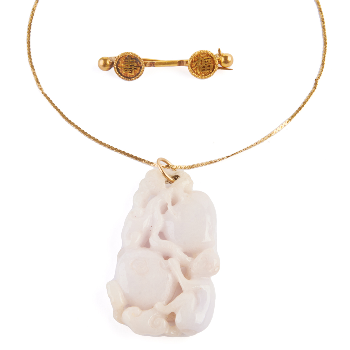 Including one carved jadeite jade animals with fruit pendant measuring approximately 55 x 32 mm, 14k yellow gold 18 inch necklace together with a Chinese 14k yellow gold bar brooch measuring approximately 10 x 45 mm.