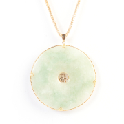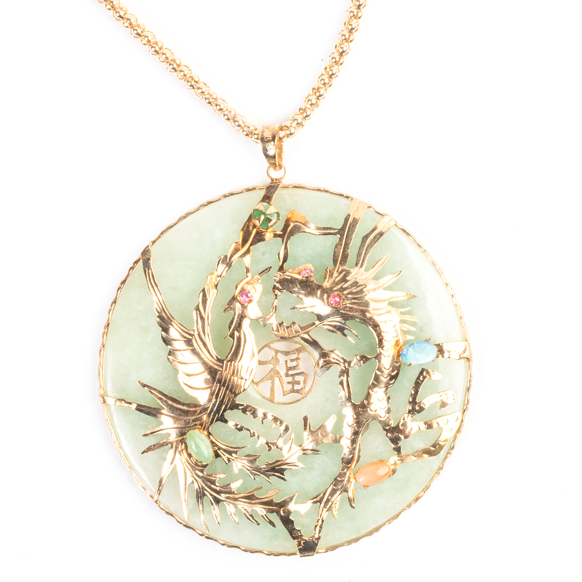Featuring one jade bi disc, accented by ruby, opal, coral and emerald, set in a 14k yellow gold dragon and phoenix motif mounting measuring approximately 51 mm, suspended from a 14k yellow gold chain, forming a 19 inch necklace.