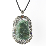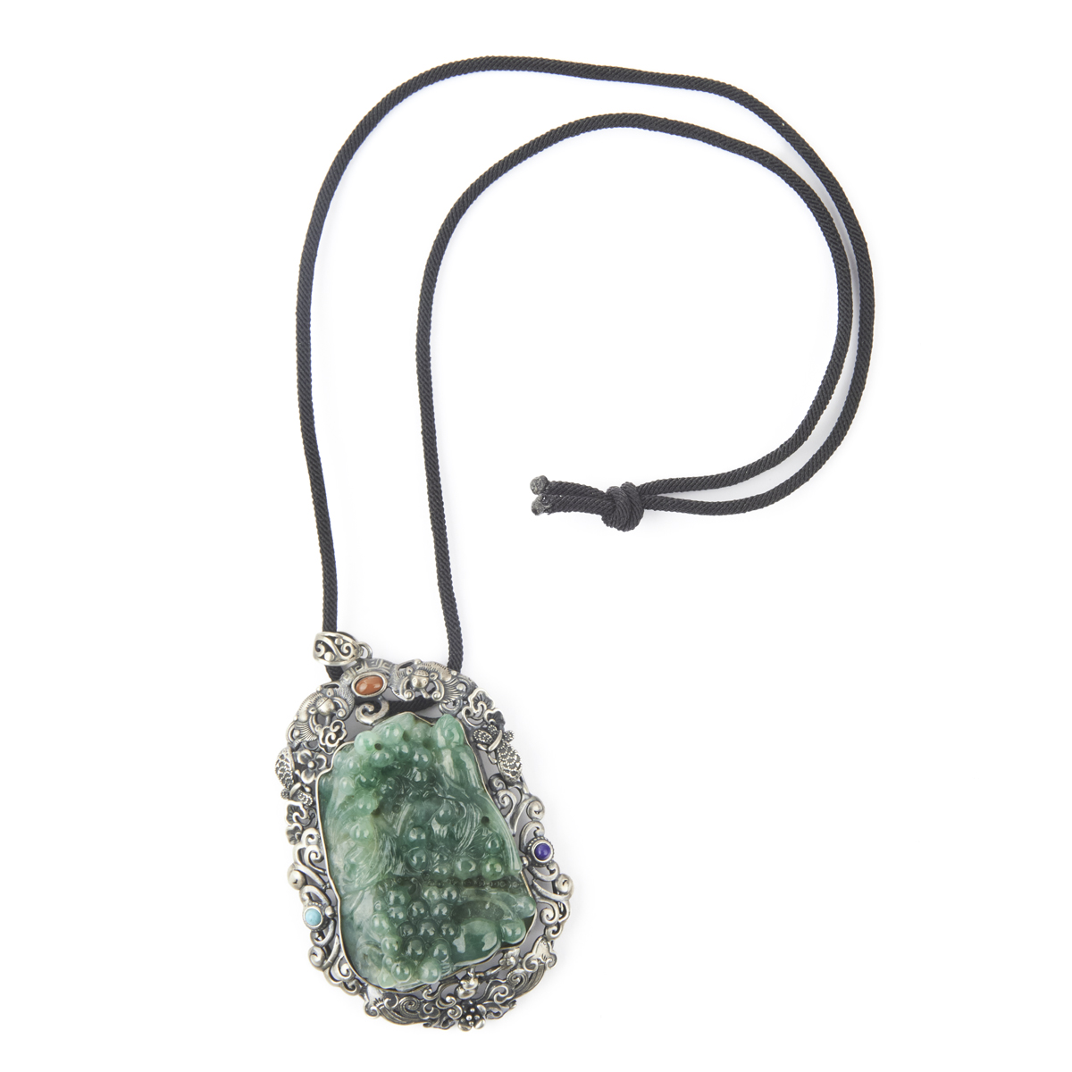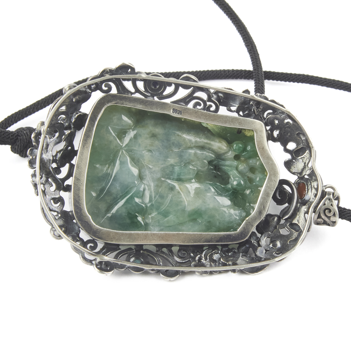 Featuring a carved jadeite jade pendant depicting grapes and berries and measuring approximately 49 x 35 mm, accented by one coral, lapis lazuli and turquoise cabochon, set in a sterling silver bat and butterfly motif mounting measuring approximately 81 x 51 mm.