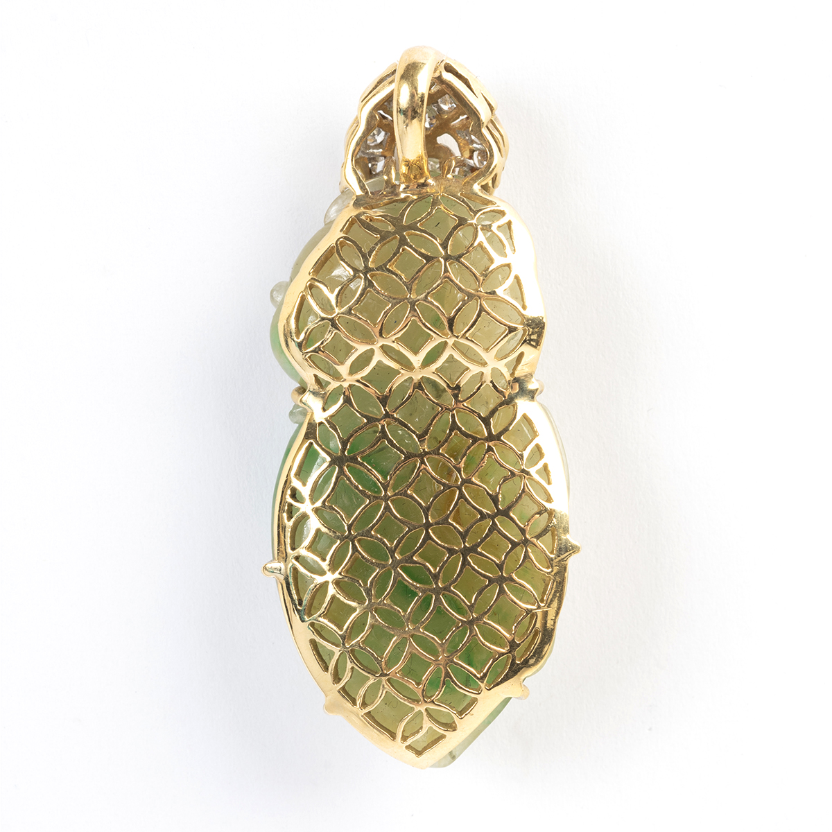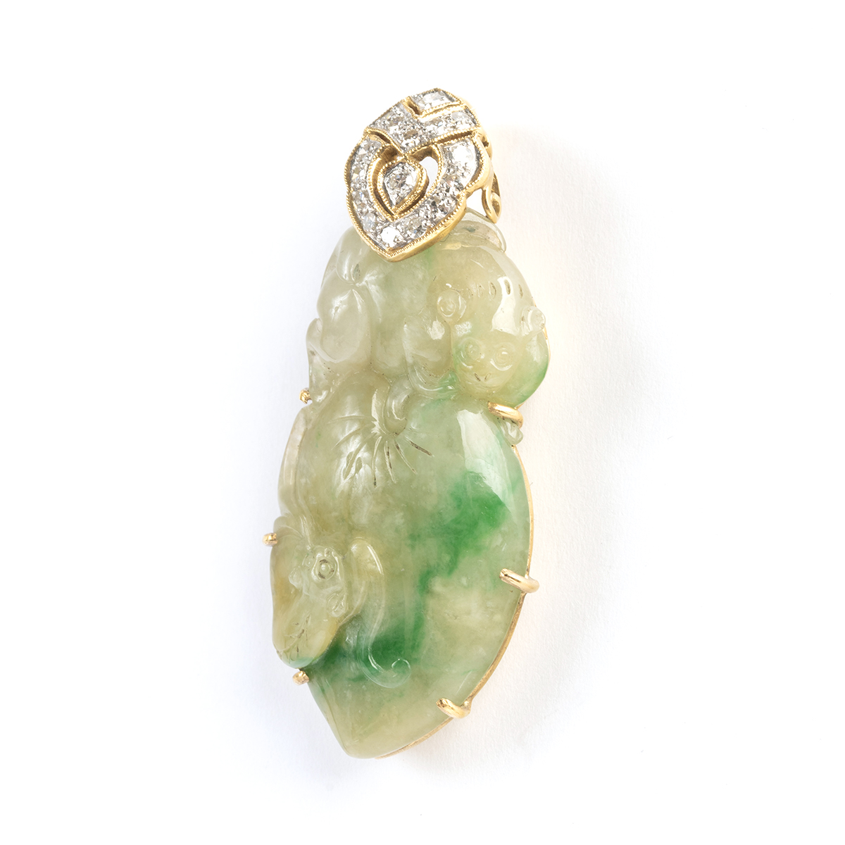 Featuring one carved jadeite jade pendant depicting animals and fruit, accented by sixteen round-cut diamonds weighing a total of approximately 0.25 cttw., set in an 18k yellow gold mounting measuring approximately 44 x 20 mm.