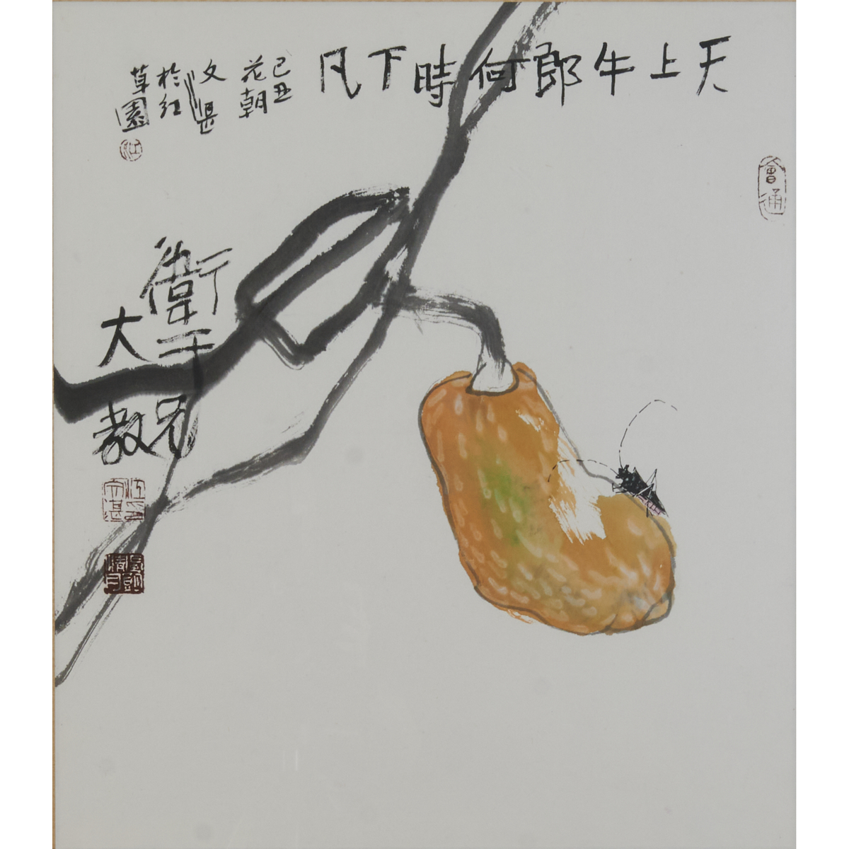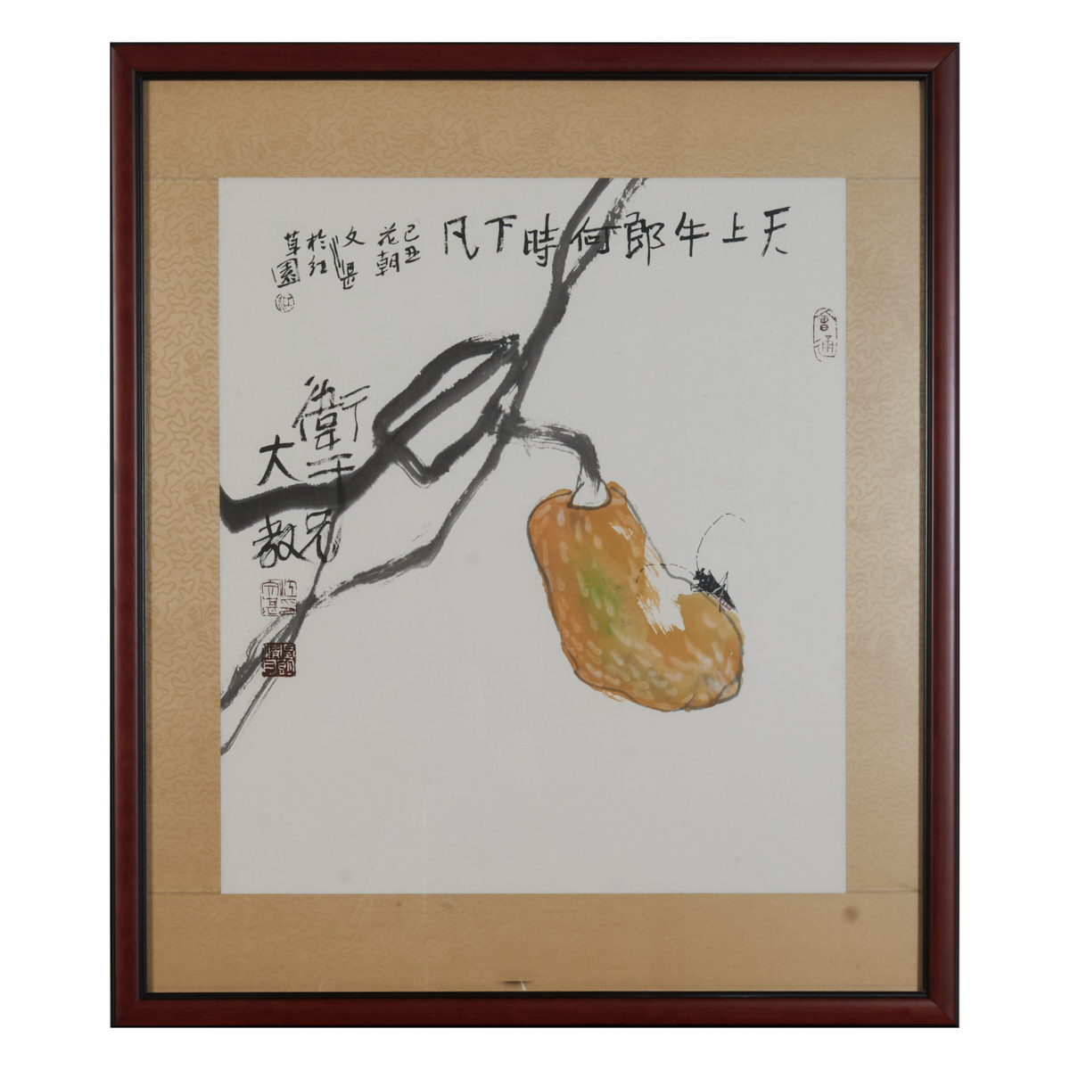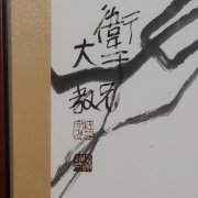 Ink and color on paper, dated 1985, framed and signed Wenzhan with three artists stamps and one collector stamp.