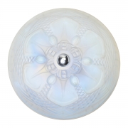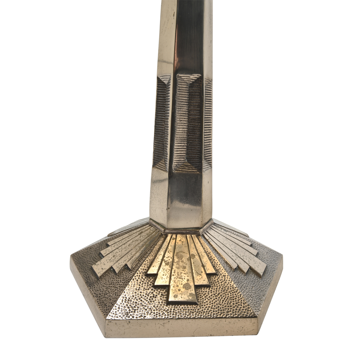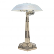 Opalescent glass shade, hexagonal nickel-plated stem and base, European socket with adapter.