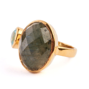Featuring one oval shaped, faceted-top labradorite measuring approximately 16 x 12 mm, accented by one round-cut blue topaz, bezel set in a vermeil cuff ring mounting.