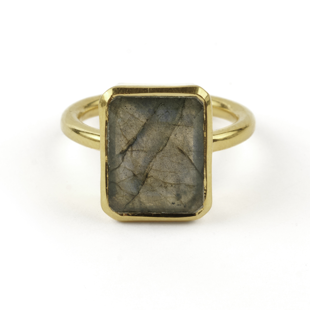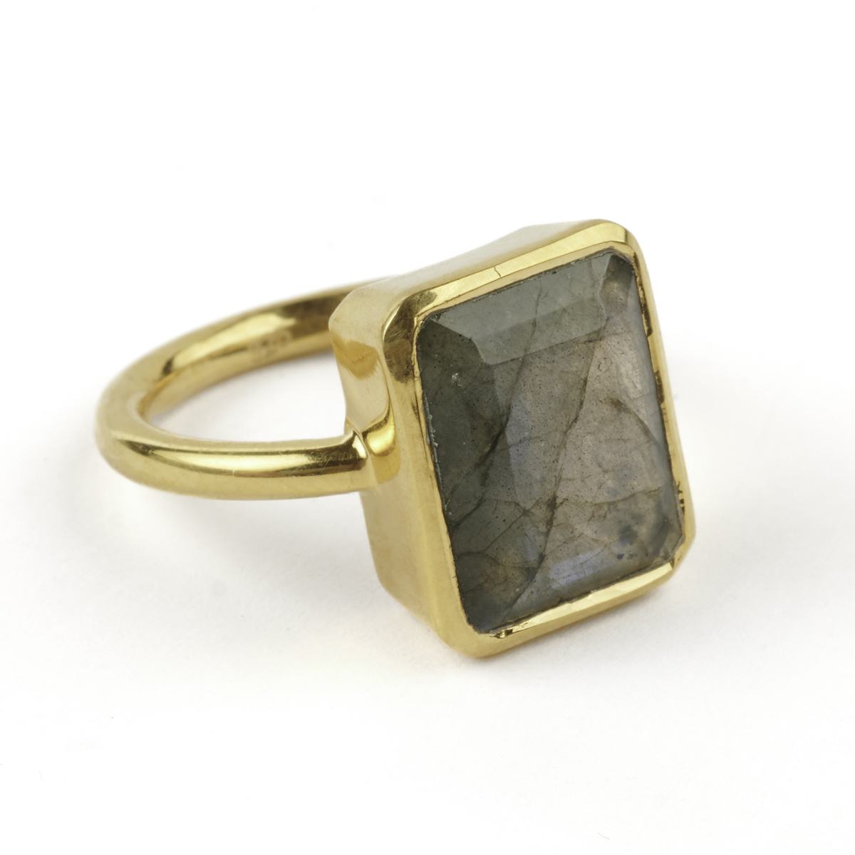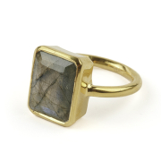Featuring one emerald-cut labradorite measuring approximately 13 x 10 mm, bezel set in a vermeil mounting.