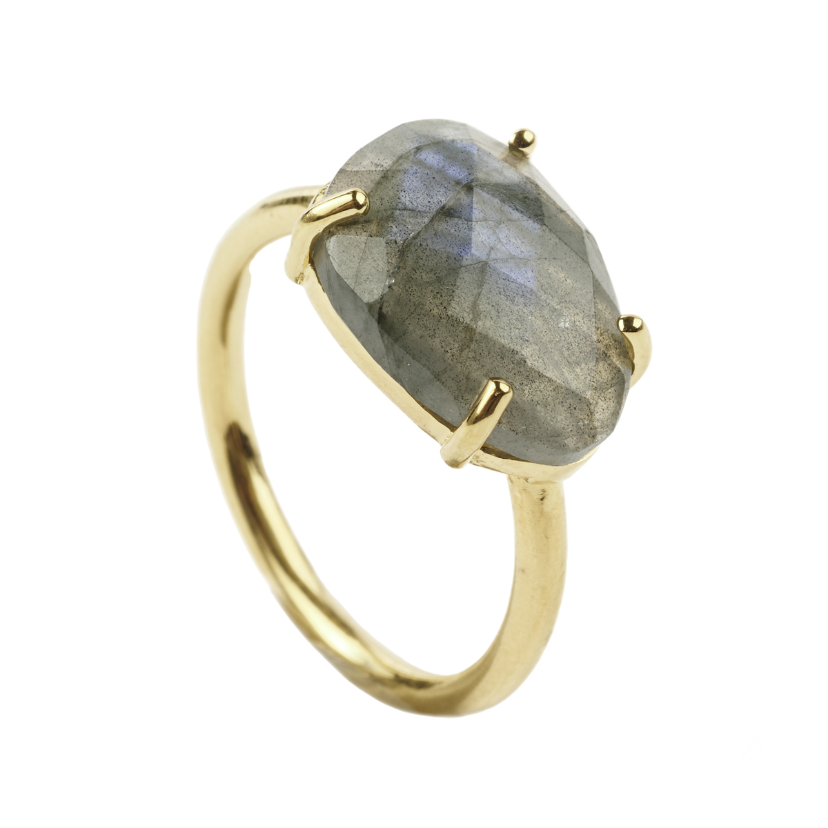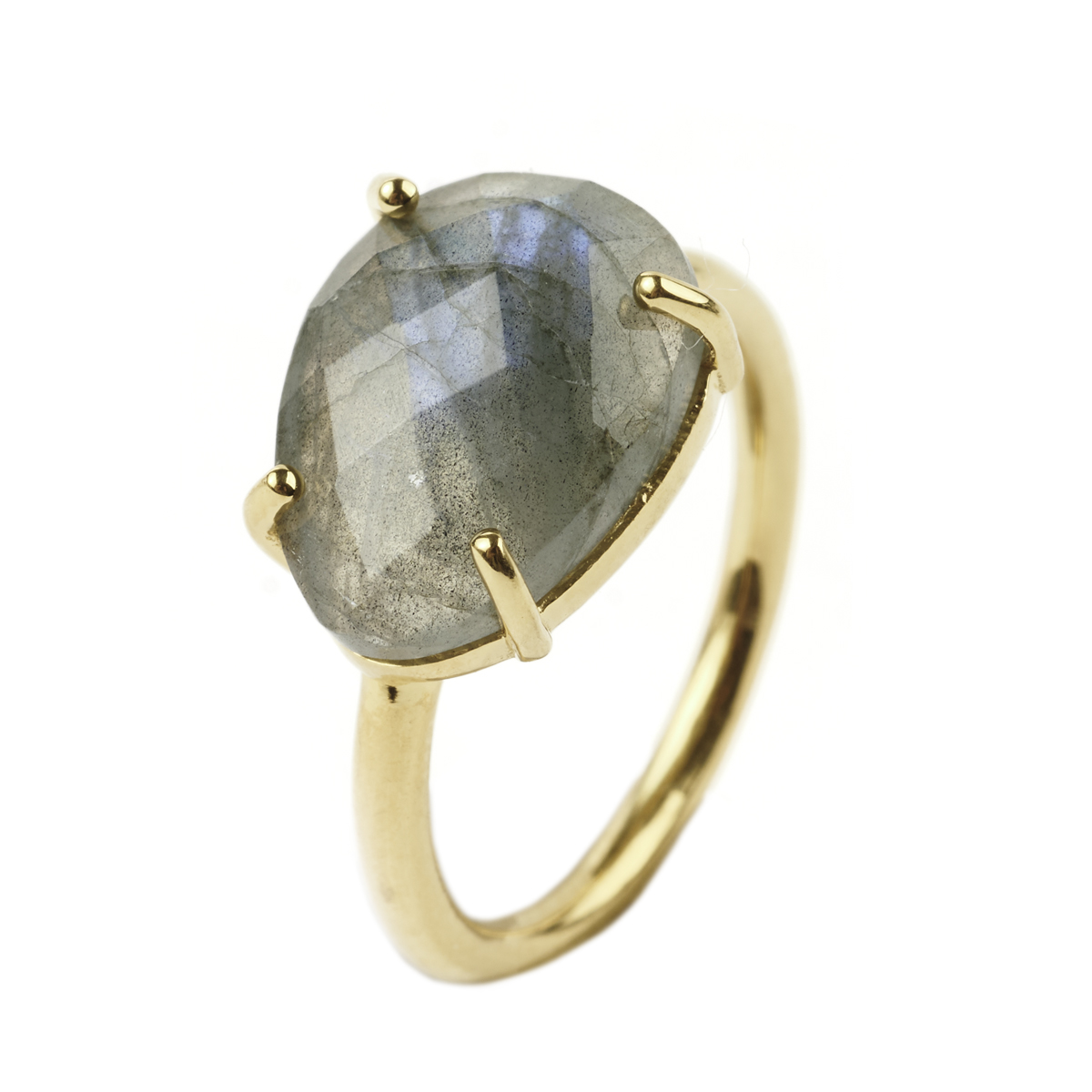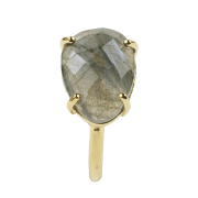 Featuring one pear shaped, faceted-top labradorite cabochon measuring approximately 14 x 10.5 mm, four prong set in a vermeil mounting.