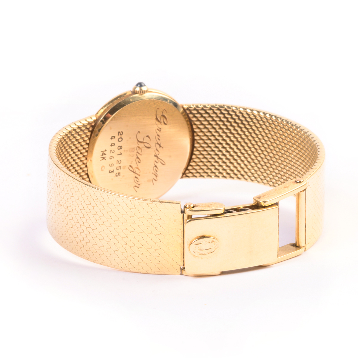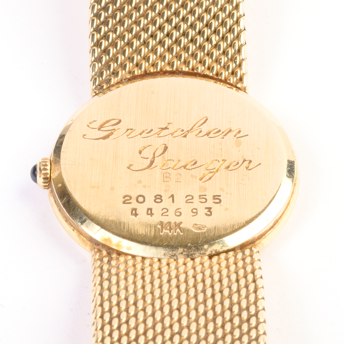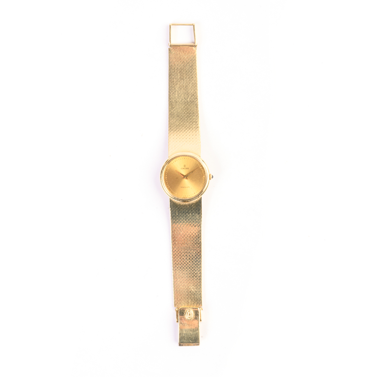 DIAL: Round, gold, gold dot outer minutes track, gold dauphine hands, Concord, nine/quartz. MOVEMENT: Quartz battery (not opened). CASE: Round, 14k yellow gold, snapback (not opened), 2081255, 442693, back engraved Gretchen Laeger, 23 mm. BRACELET: 14k yellow gold, smooth link tapering from 15 mm to 13 mm, fold over clasp, 5 1/2 inches.
