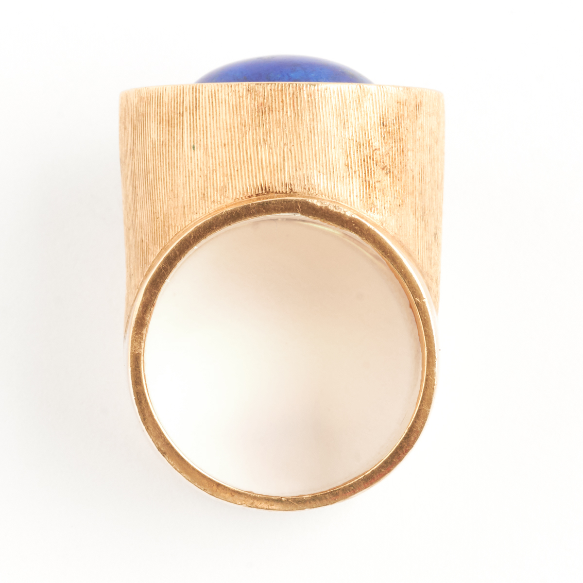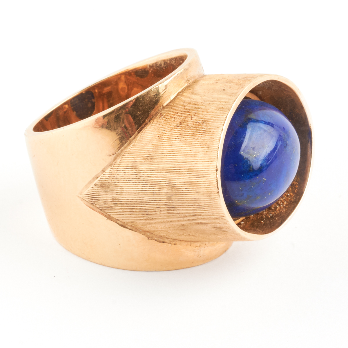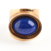 Featuring one oval shaped lapis lazuli cabochon measuring approximately 16.2 x 12.2 mm, set in a 14k yellow gold brushed and polished mounting measuring approximately 21 mm in width.