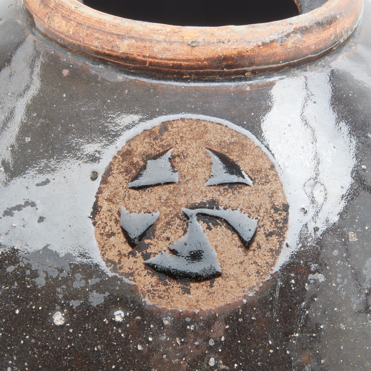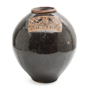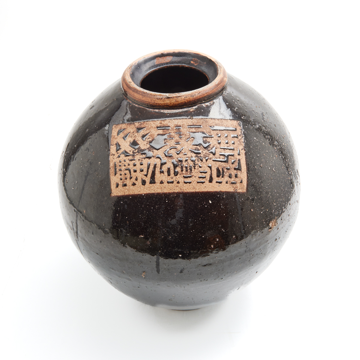 Of almond form with wide body and narrow neck and base, accentuated by an all-over dark brown glaze, product and makers name written near the top, identifying the double steamed wine from Jiujiang in Guangdong province.