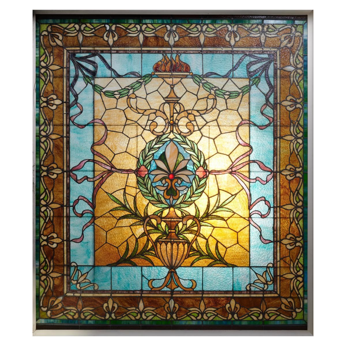 With urn issuing floral medallion on amber ground within blue reserve, brown main border with meandering foliate motif, in white painted wood frame.