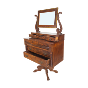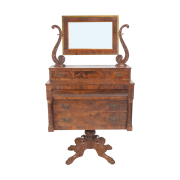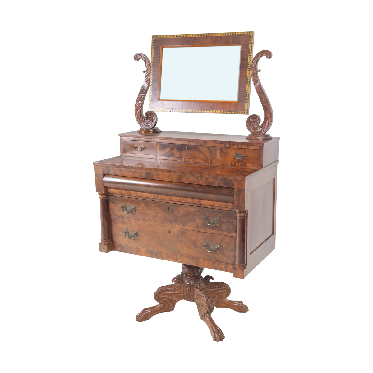 Mirror supported by foliate scrolls, above three short drawers with brass bat pulls, three long drawers below the main surface flanked by round engaged columns, the chest raised on quadruped pedestal base with foliate carving and claw feet.