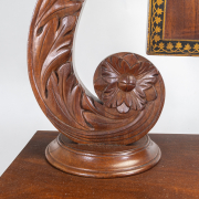 Condition: Some surface wear throughout, including scratches to top and minor finish low. Break and repair to mirror support base. Small veneer loss to rear corner.