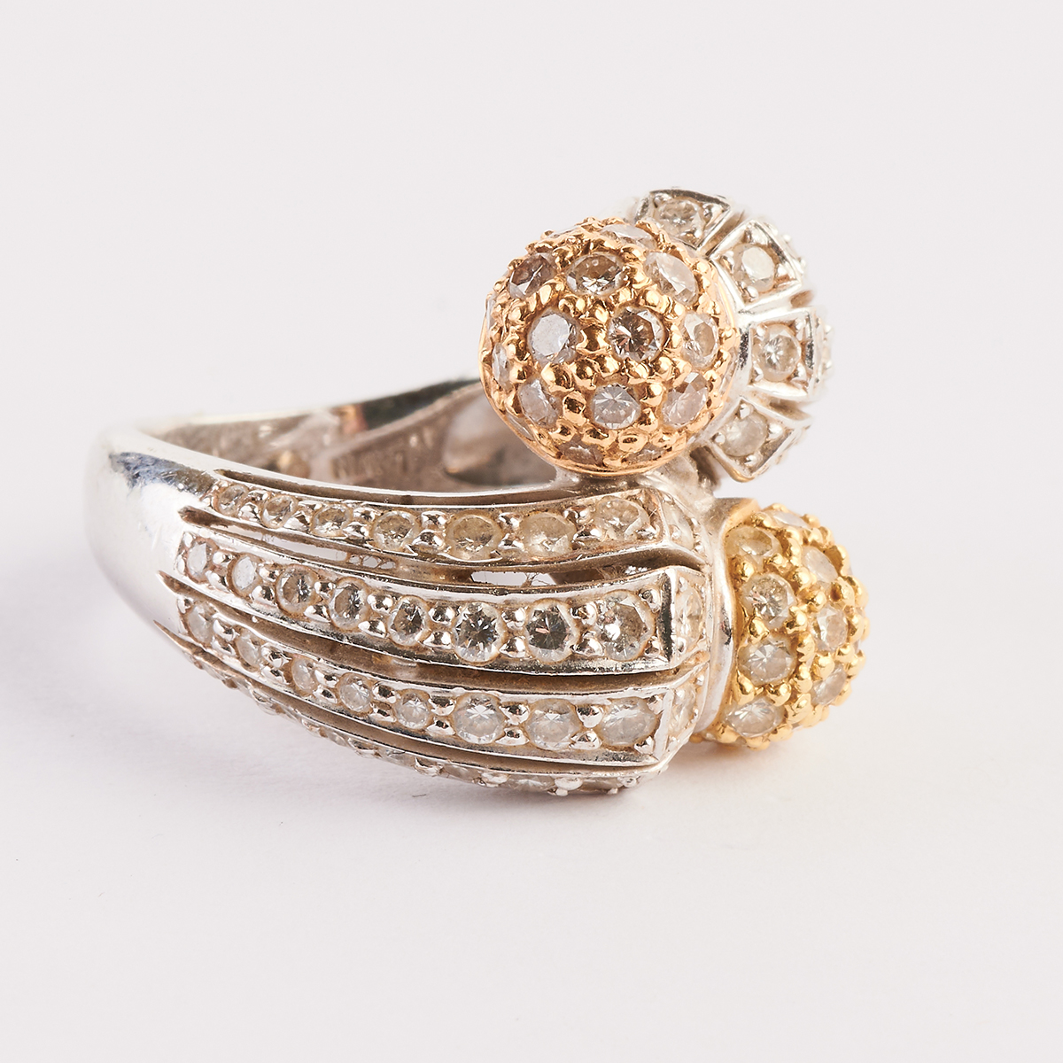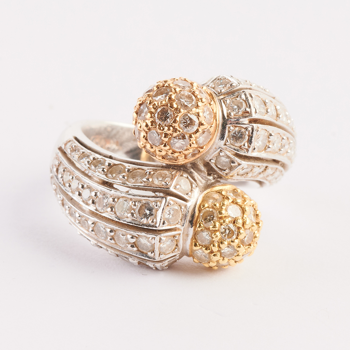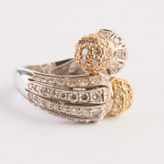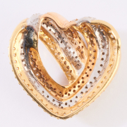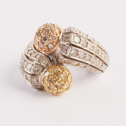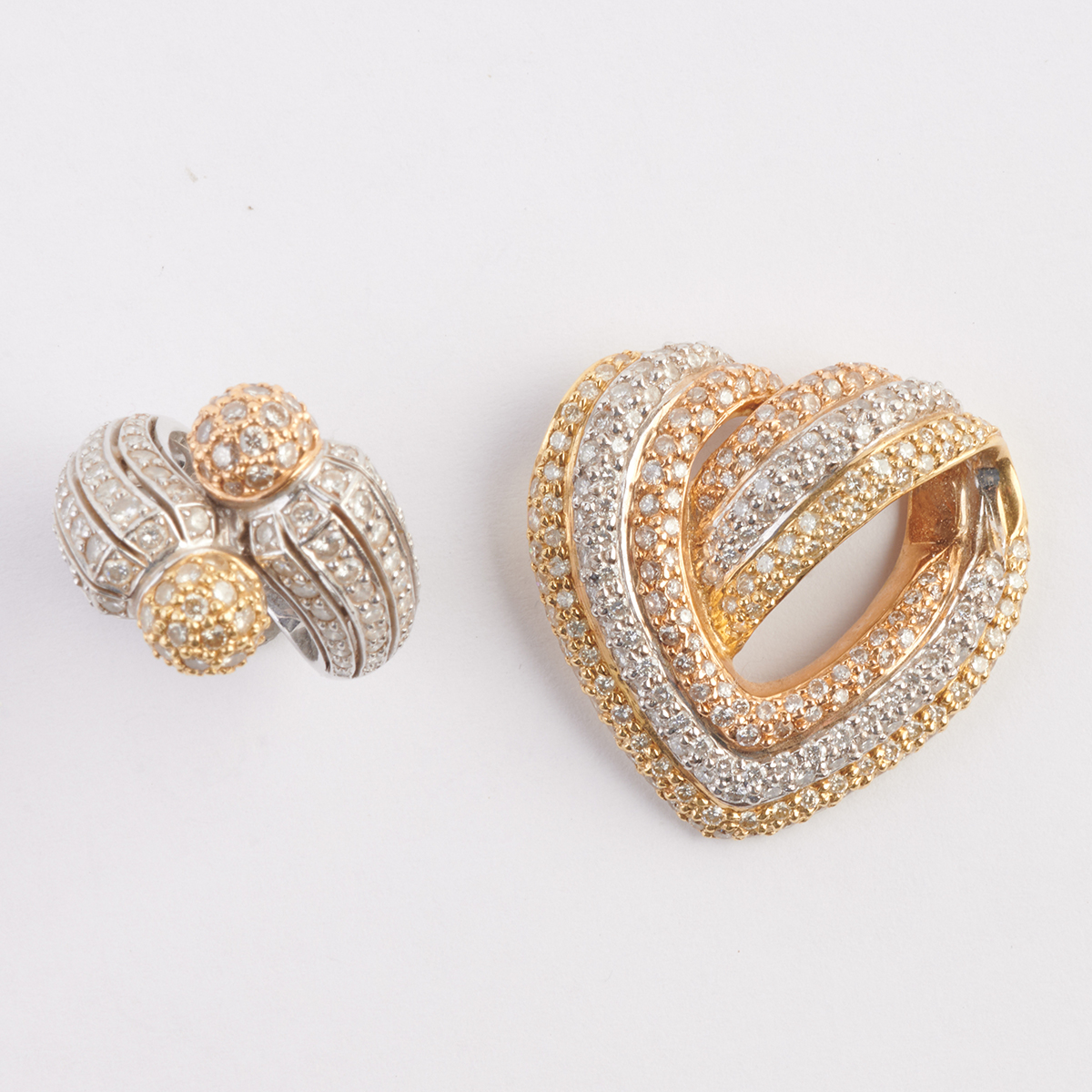 Including one white, yellow and champagne diamond, 18k white, yellow and rose gold open heart pendant measuring approximately 32 x 33.5 mm together with a white, yellow and champagne diamond, 18k white, yellow and rose gold ball form bypass ring, size 5 1/2. Total diamond weight for the suite is approximately 3.30 cttw.