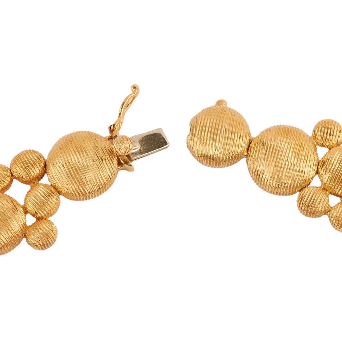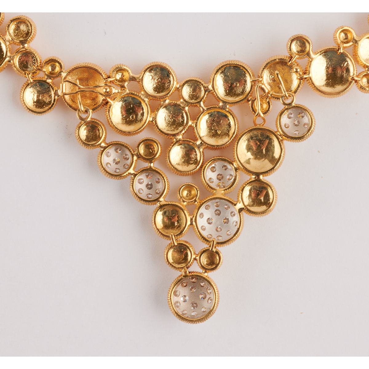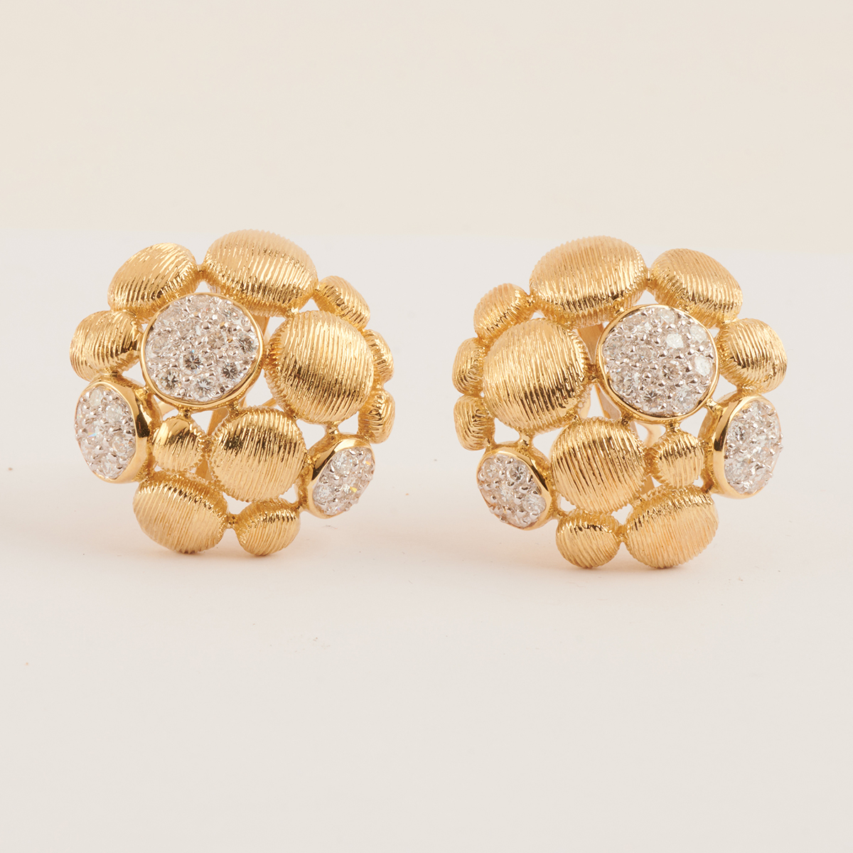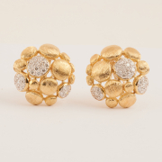 Including one full-cut diamond, brushed 18k yellow gold bubble motif, 15 inch necklace together with a matching pair of diamond, brushed 18k yellow gold bubble motif bombe earrings measuring approximately 30 mm. Total diamond weight for the suite is approximately 2.50 cttw. Diamond portion of the necklace can be removed and worn separately.