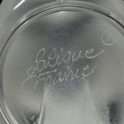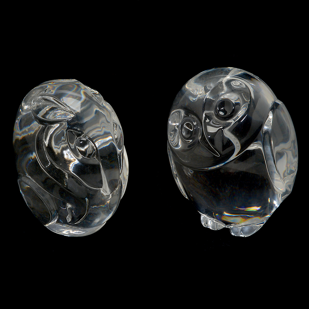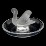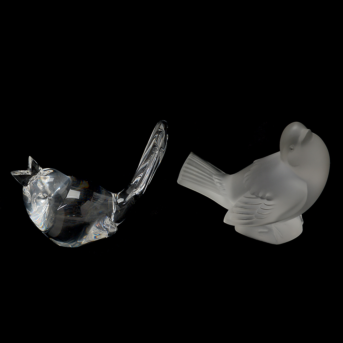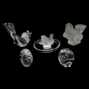 Comprising a Lalique pigeon, Lalique swan in dish, Steuben chirping bird, Steuben owl, and a Steuben mouse.