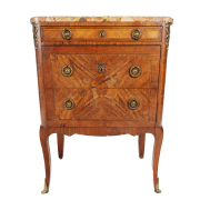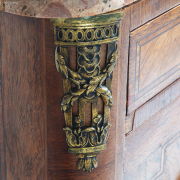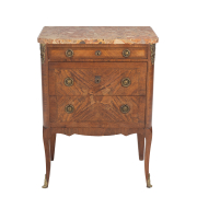Marble top over three drawers, the bottom two drawers with musical motif marquetry plaque, gilt metal mounts.