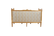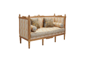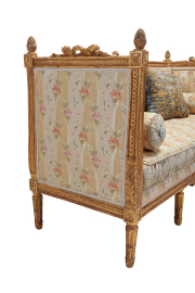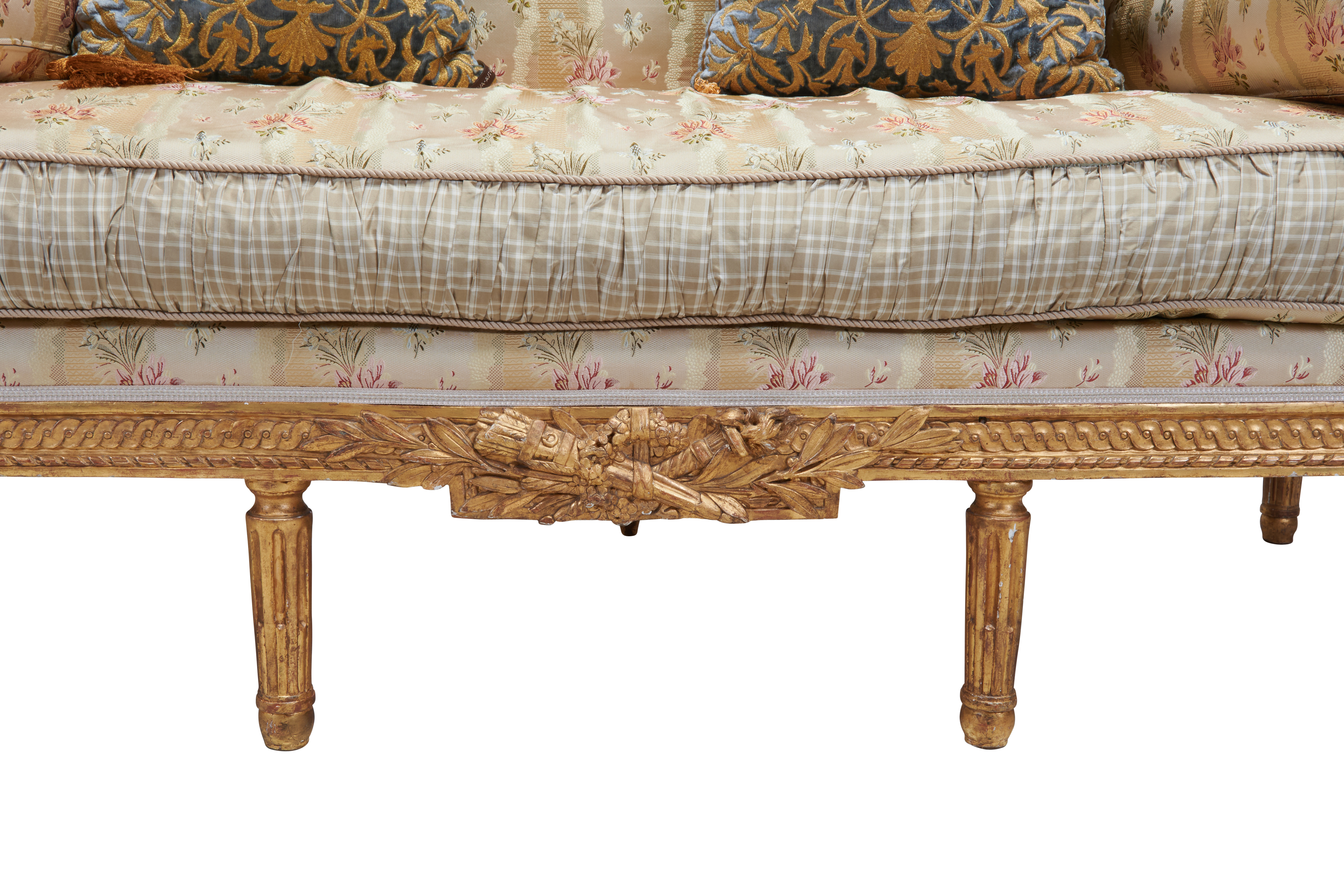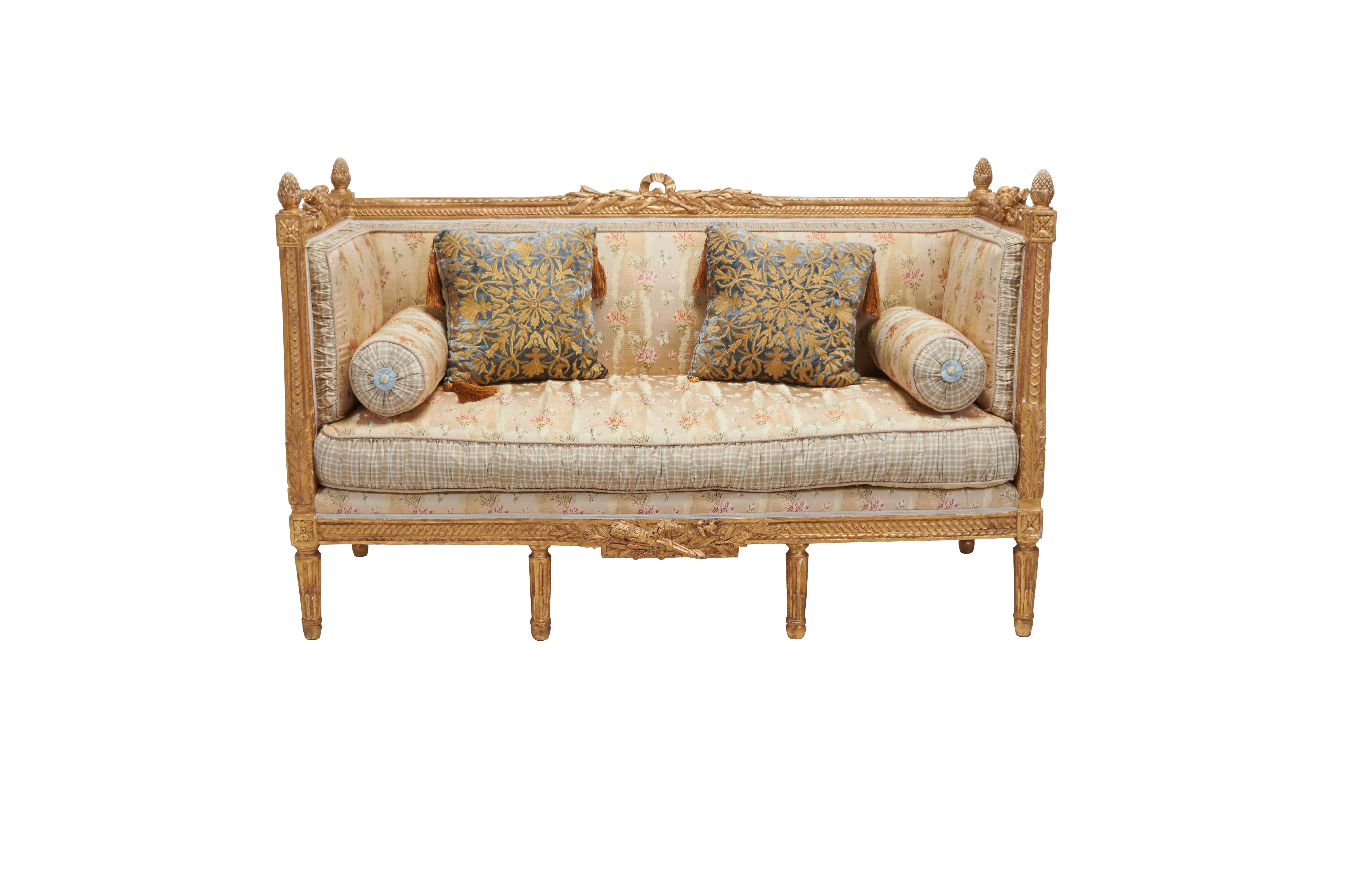 By Martin Delaporte carved giltwood frame, silk upholstery with embroidered floral motif two matching cylindrical cushions and two blue velvet with gold brocade throw pillows.