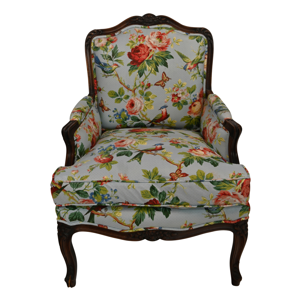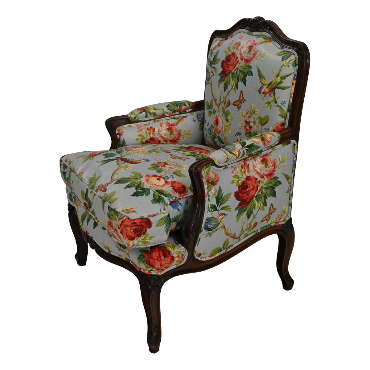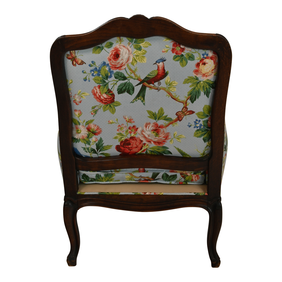 The carved dark wood frame upholstered with bird and rose motif on a sky blue ground.