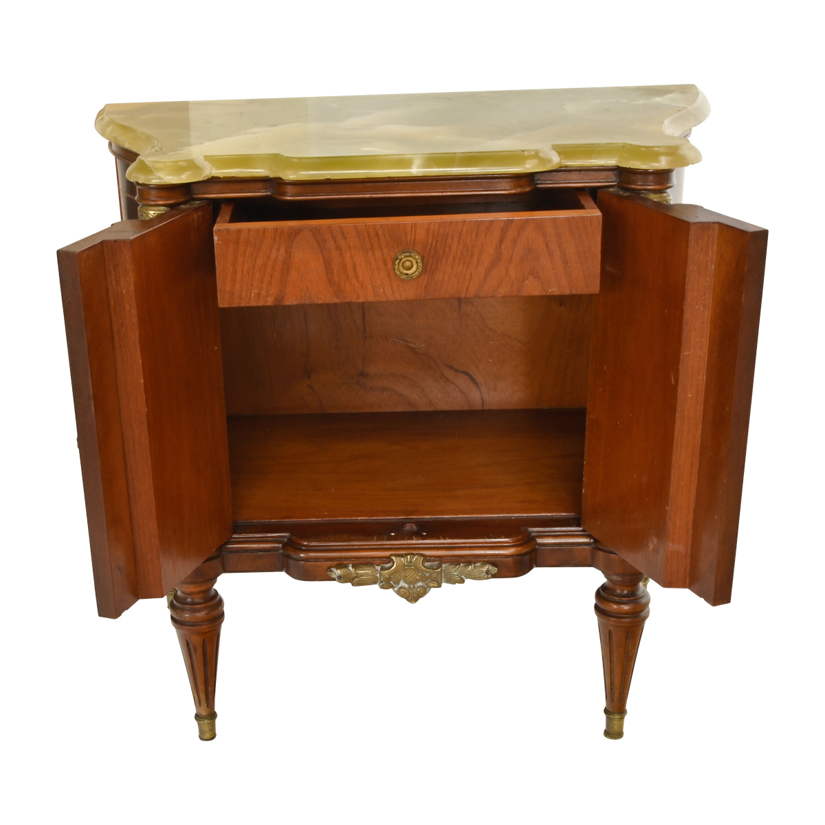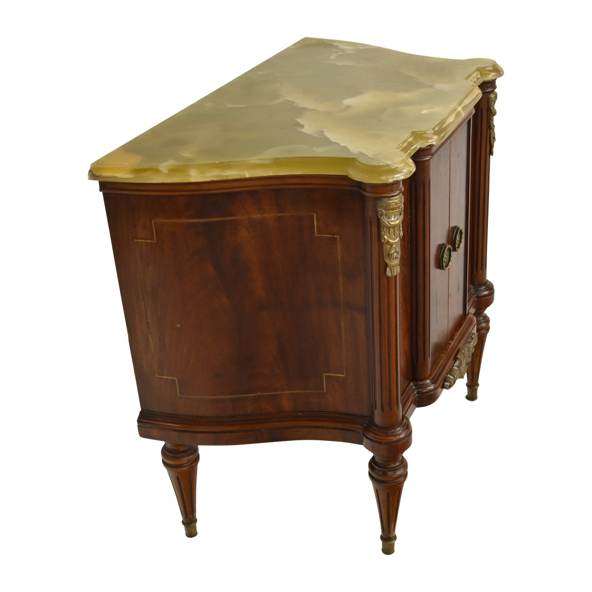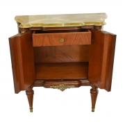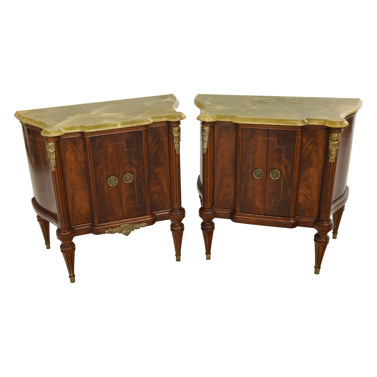 Green onyx tops, small two door cabinet concealing drawer and storage space, gilt bronze mounts.