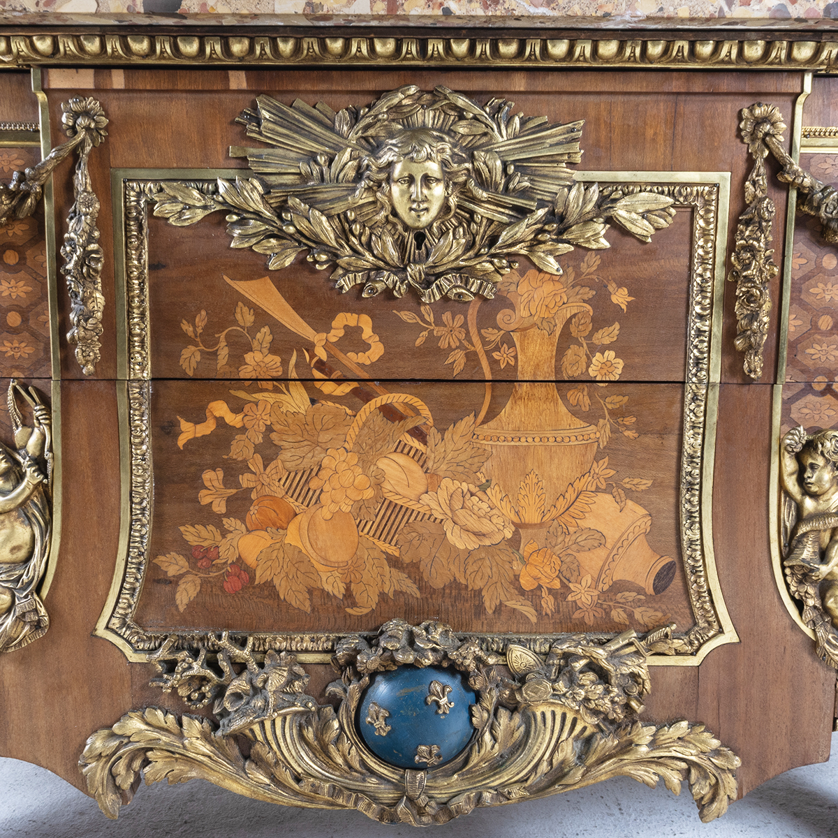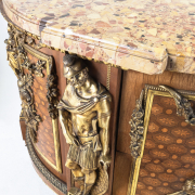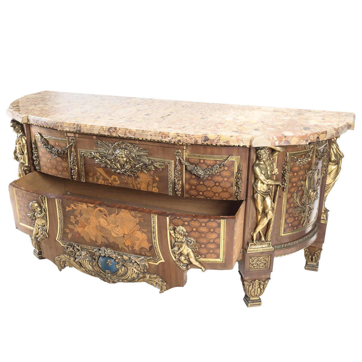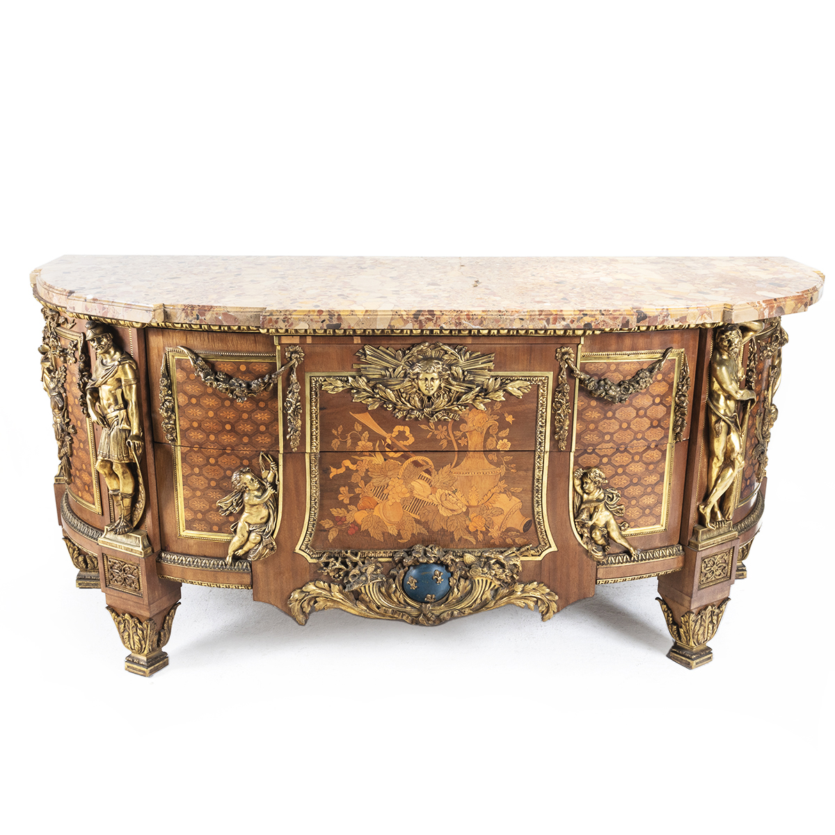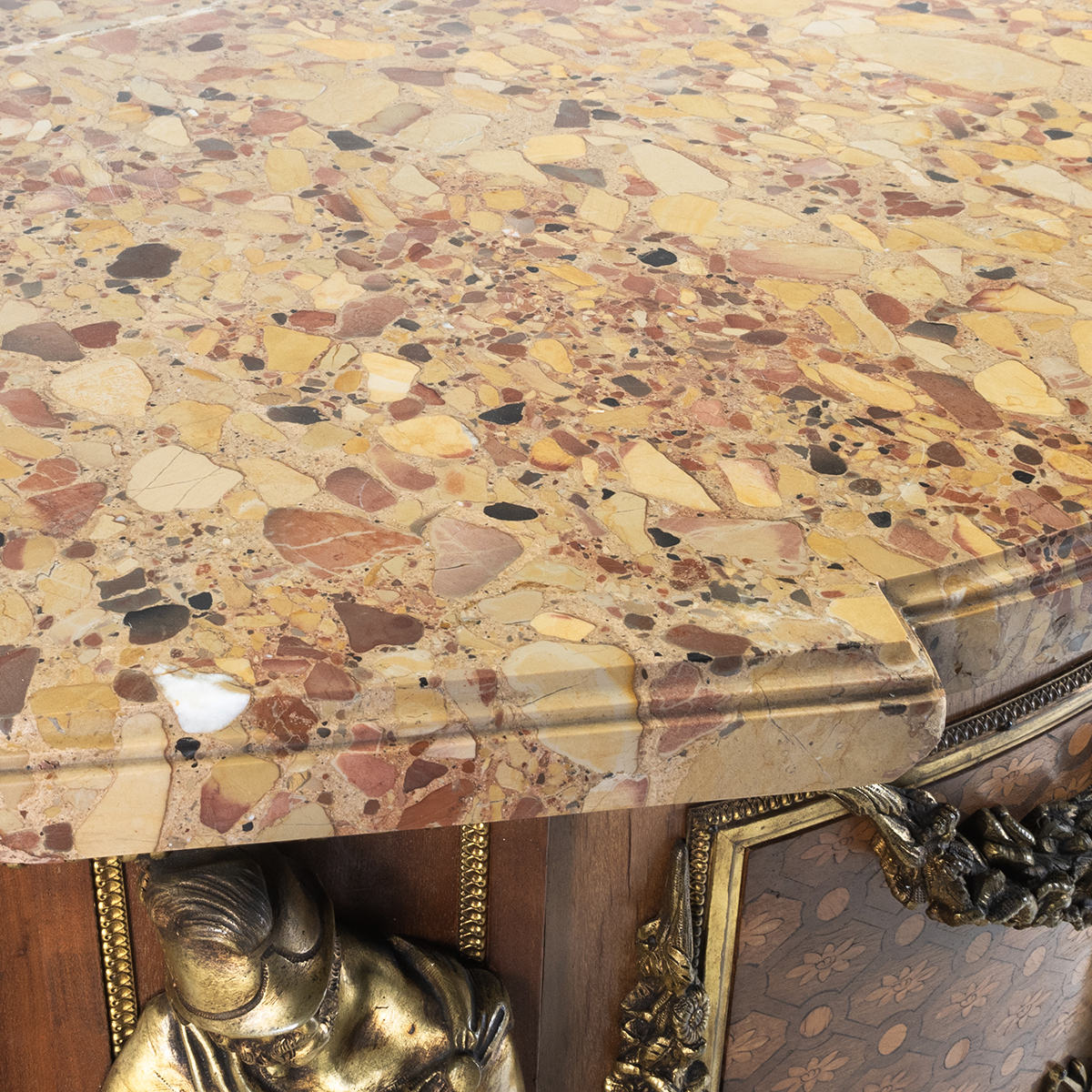 Brech dAlep marble top with moulded and shaped edge, over two large drawers flanked by single door cabinets on either side, decorated with marquetry and gilt bronze mounts throughout.