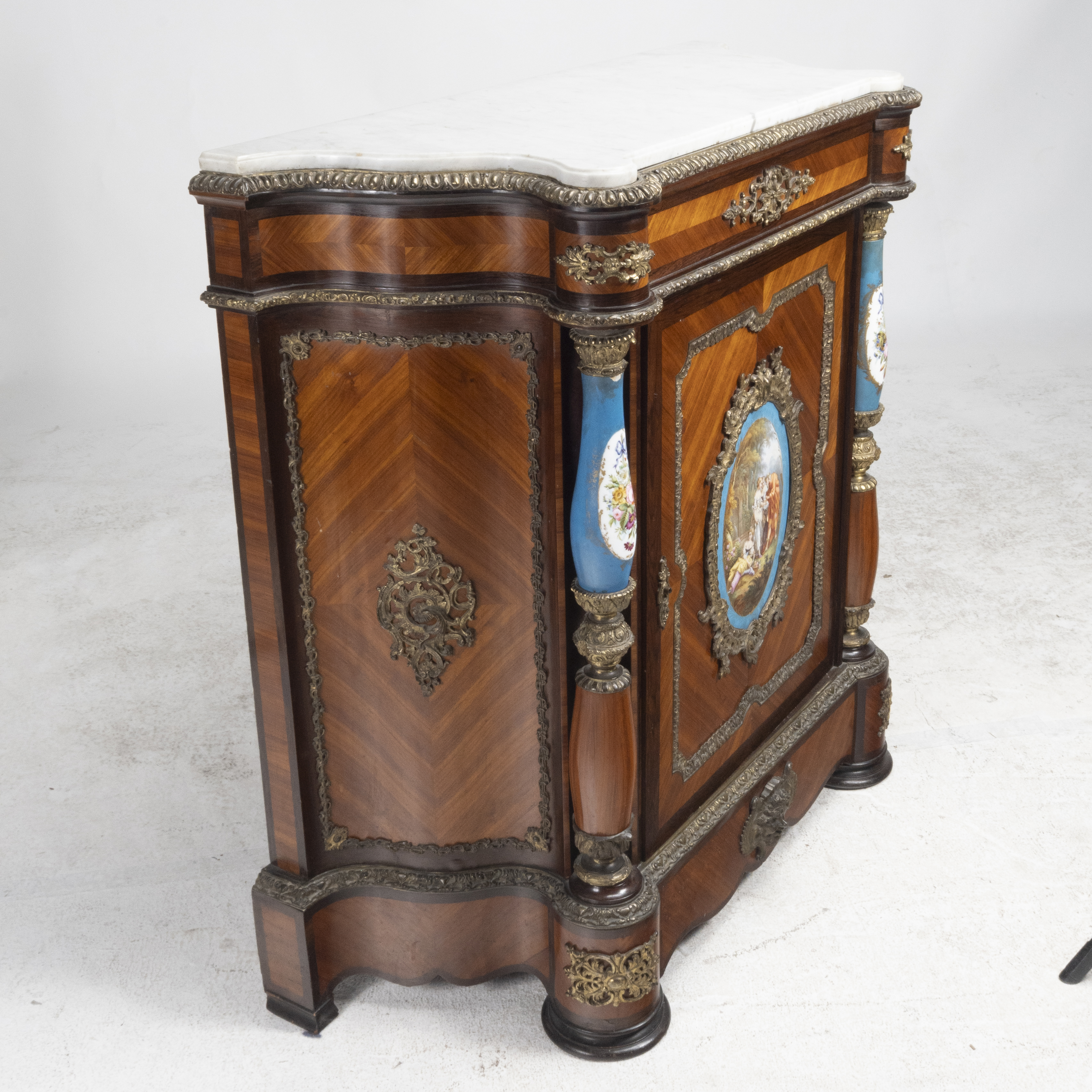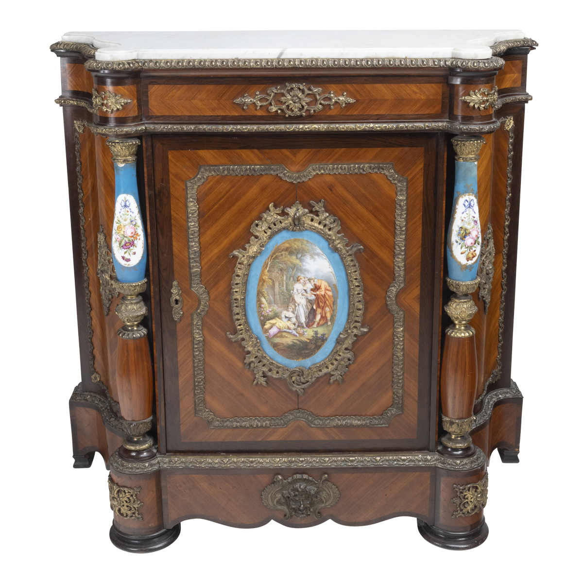 White marble top, single door cabinet with porcelain plaque, the door flanked by porcelain vasiform standards, gilt bronze mounts throughout.