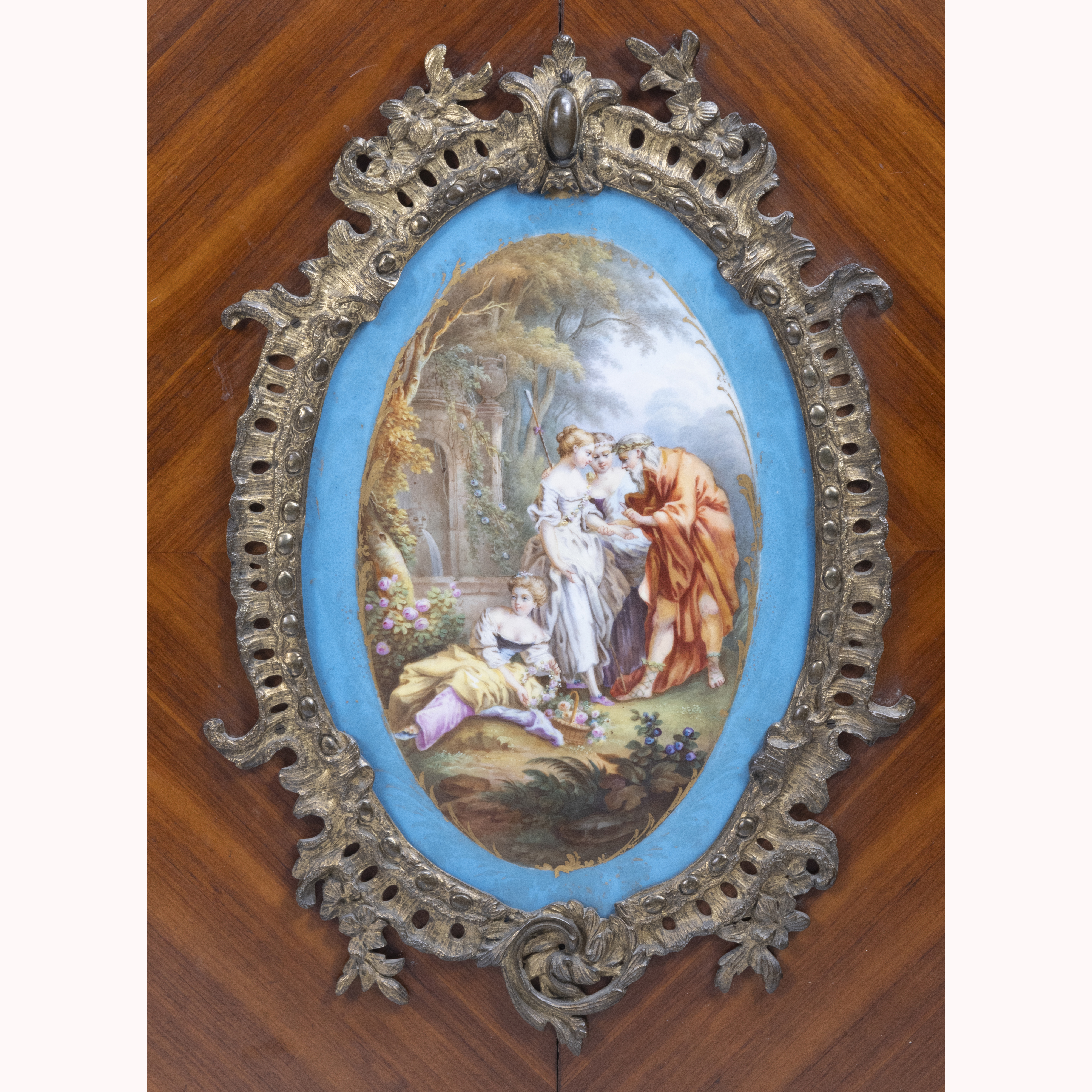 Condition: Light chips to marble edges. Minor surface and finish wear throughout including minor lifting to veneer. Minor gilt loss to porcelain plaque. Patina to the bronze mounts.