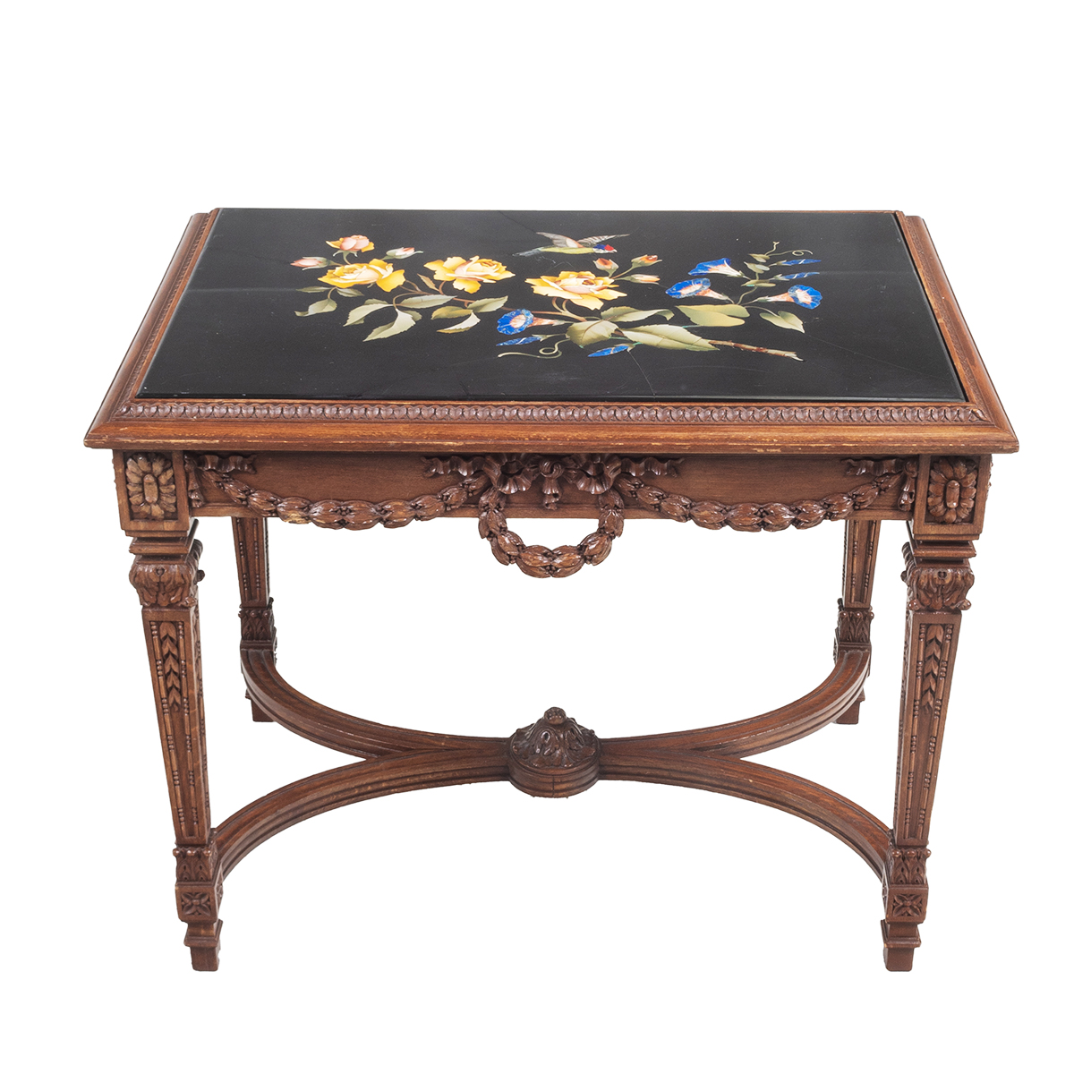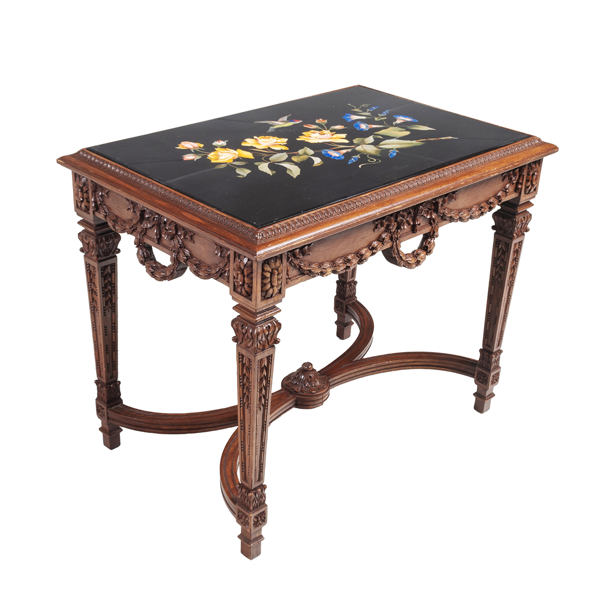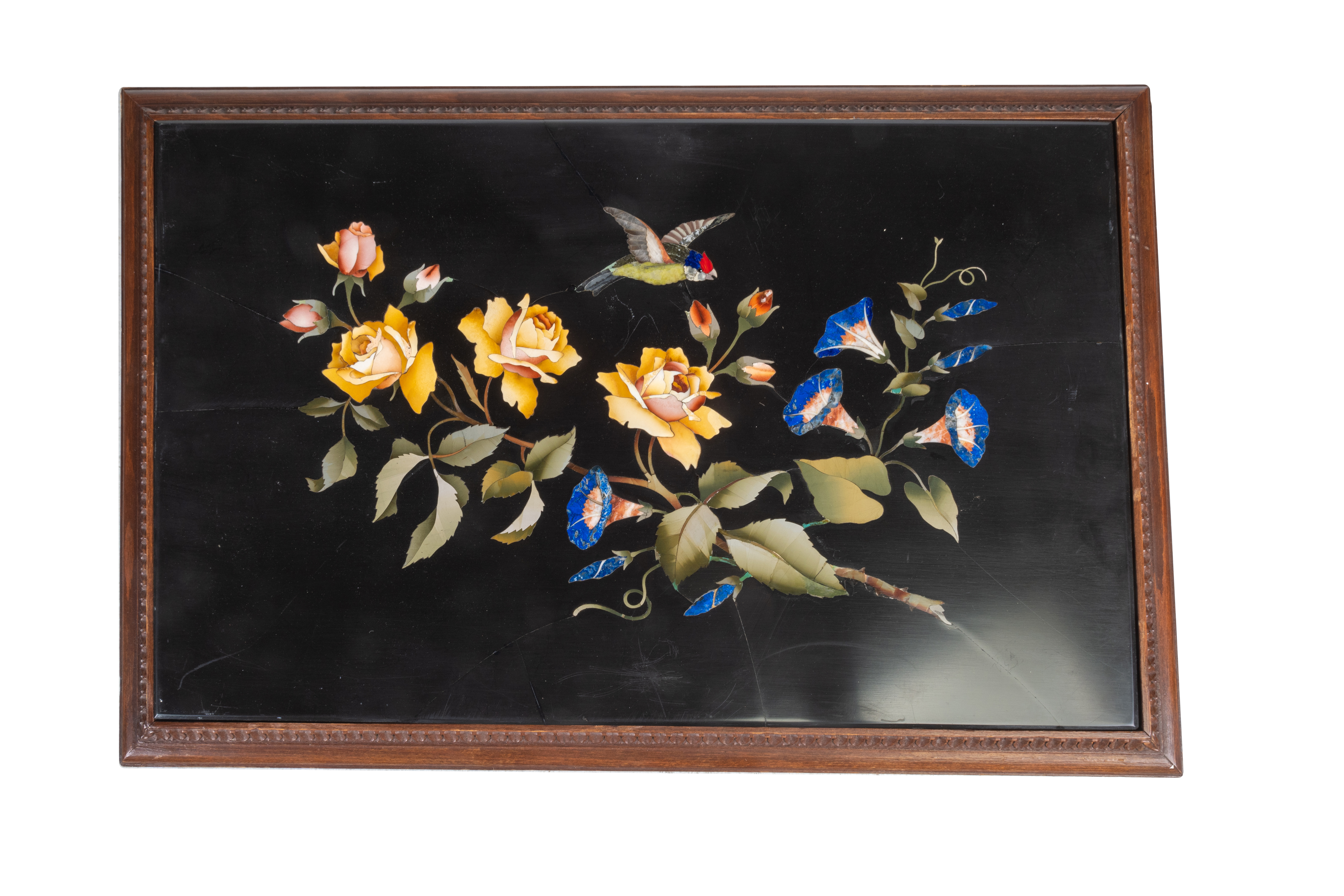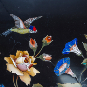 The top with roses and blue flowers with parrot above, the base carved with swags.