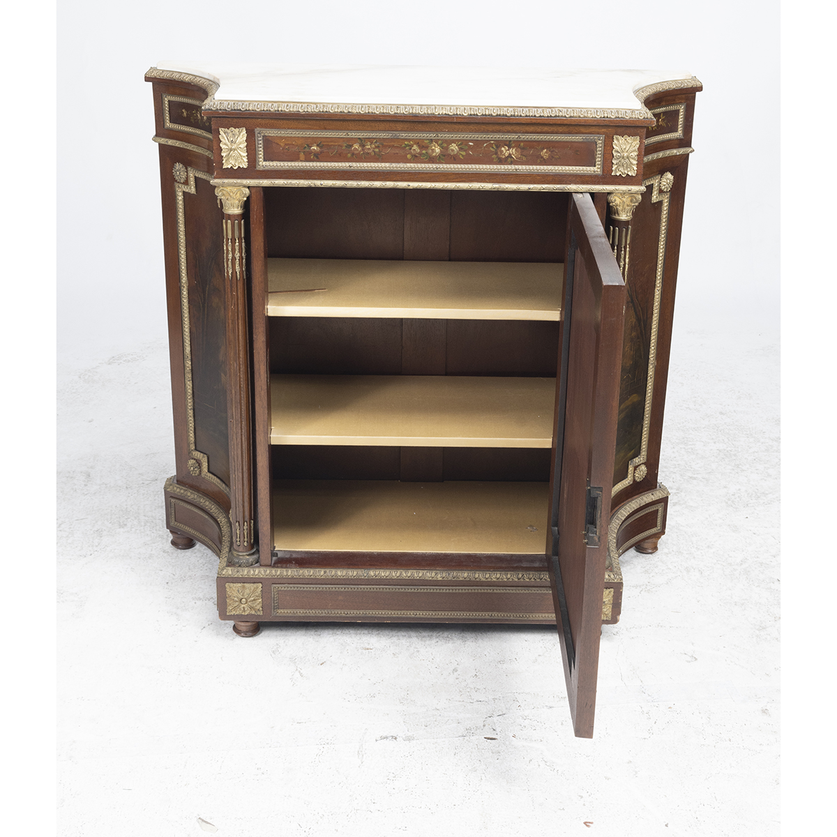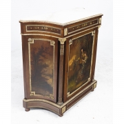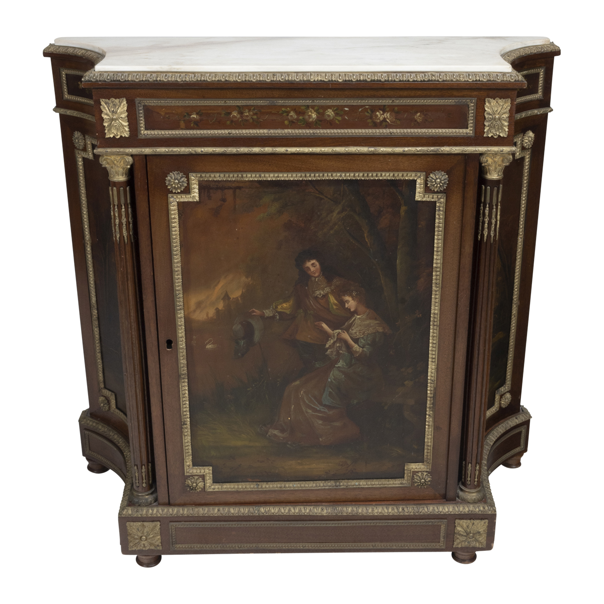 Inset white marble top, single door cabinet, gilt metal mounts, painted courtship scene to the door with landscape painted panels to the sides.