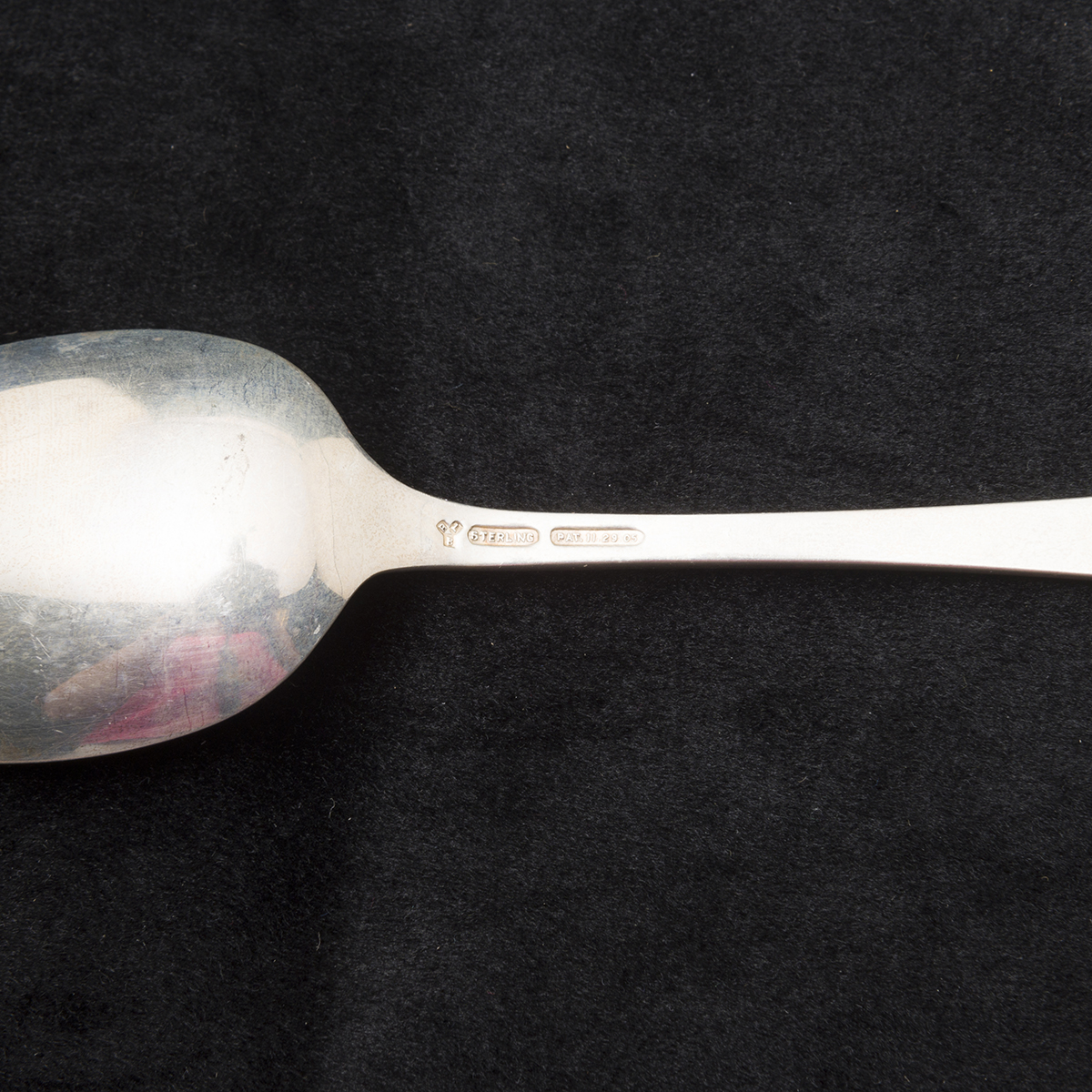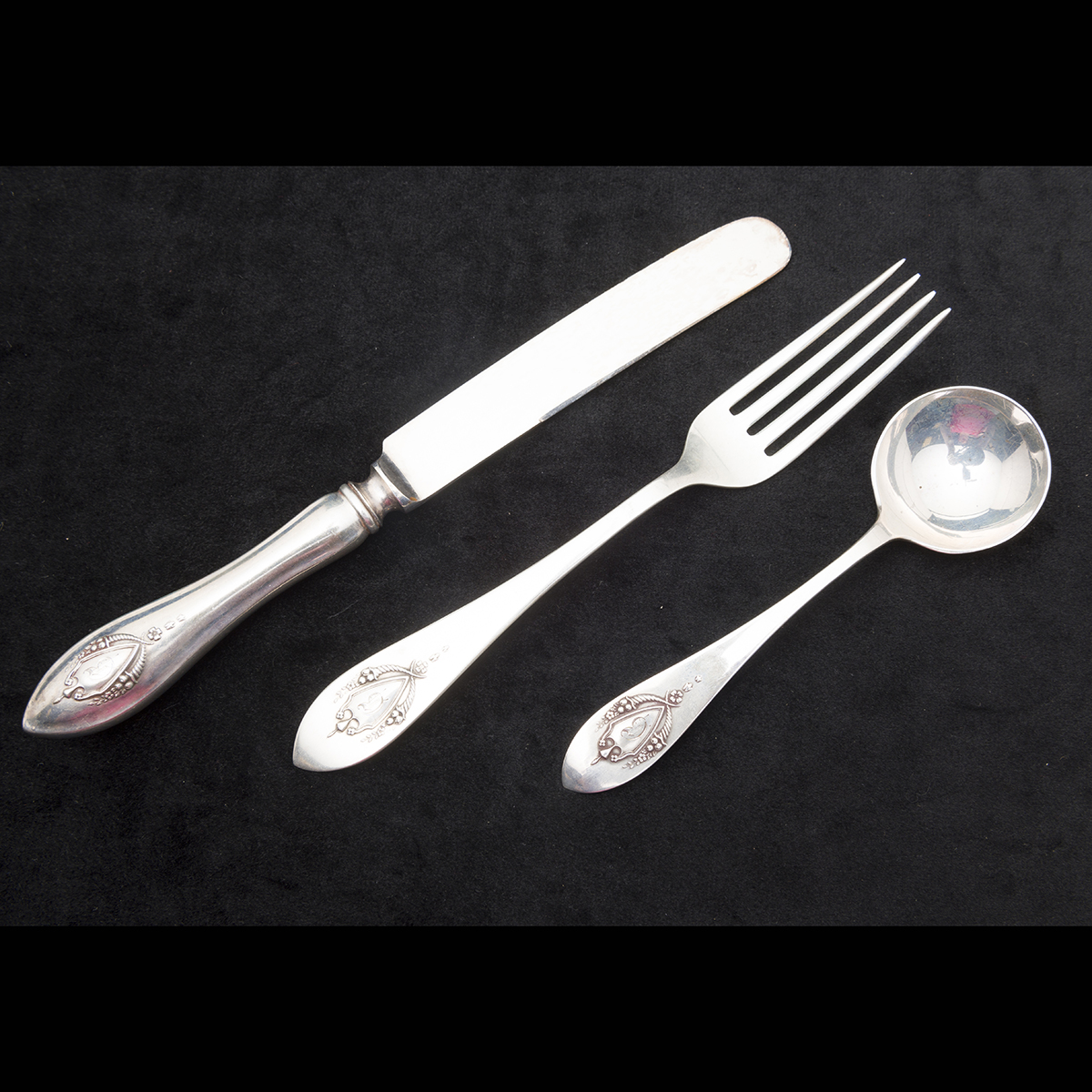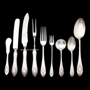 Comprising 6 dinner knives, 6 butter knives, 4 dinner forks, 6 seafood forks, 9 teaspoons, 12 bouillon spoons, 4 tablespoons, 1 carving knife, 1 carving fork. (49 pieces total).