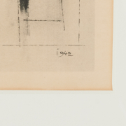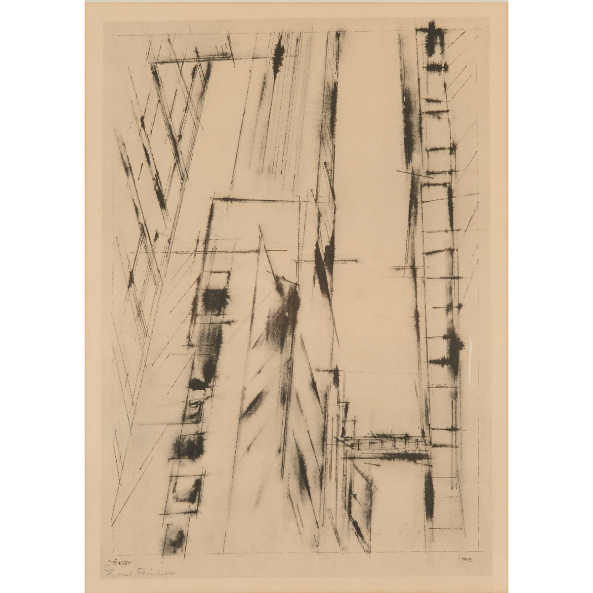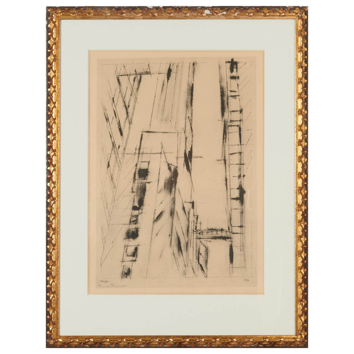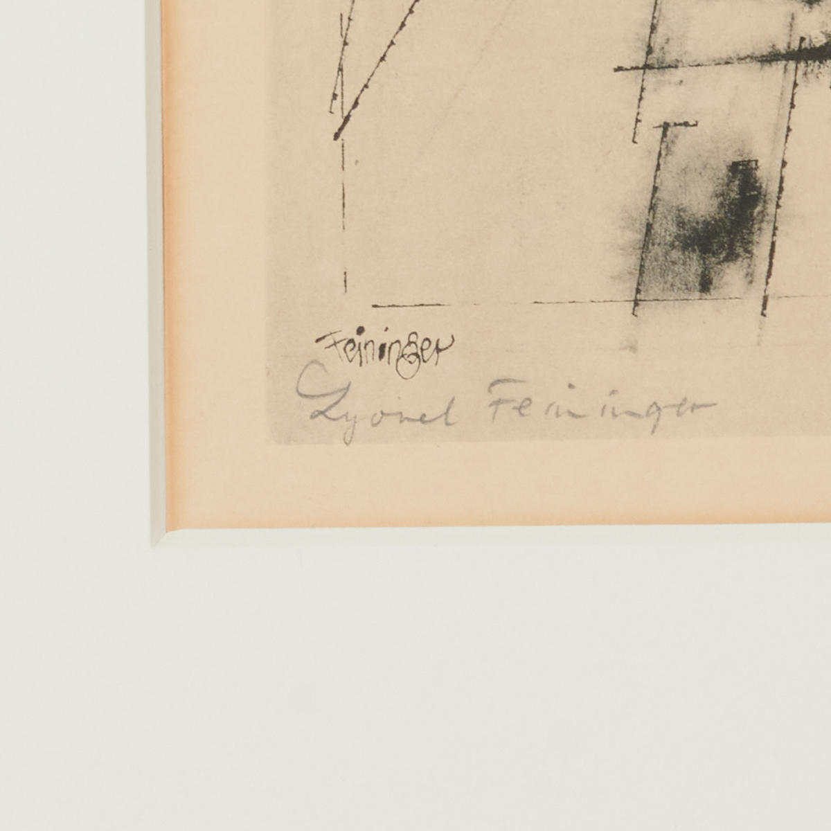 Notes: Frame has light wear, approximate dimensions - framed: 32-5/8 x 25 inches. Bio: Born in NY into a German American family of musicians. The artist studied drawing at the Kuntstgewer be Schule in Hamburg and the Akademie der Kunste in Berlin, He worked as a caricaturist in the US, Germany and France. In Berlin he starts producing paintings and drawings depicting architectural subjects and street scenes. After encountering cubism in Paris he produces work which utilizes semi-transparent planes which create prismatic effects. In 1918 he meets Walter Gropius who invites him to teach at the Bauhaud School, where he serves as head of the print department. In 1924 he founded The Blue Four Group with colleagues Kandinsky, Klee and Jawlensky. In 1937 he leaves Berlin to teach at Mills College in Oakland. In 1945 his first retrospective, with work by Marsden Hartley, is held at The Museum of Modern Art in NY. Post-humous retrospectives of his work at The Dallas Museum of Contemporary Art, The Pasadena Art Museum, as well as The Whitney Museum of American Art.