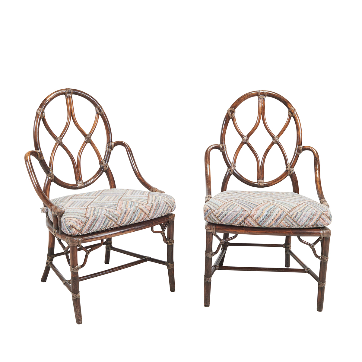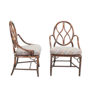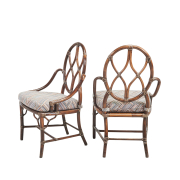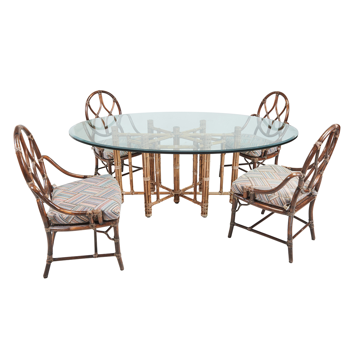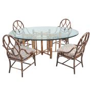 Comprising the bamboo frame table with beveled oval glass top, and four bamboo frame side chairs with oval backs and upholstered seat cushions.