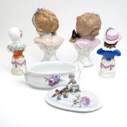 The two handled vegetable tureen with figural knop, together with a pair of Dresden busts of Bourbon prince and princess, and an assembled pair of Vienna style busts of child dancers, atop associated neoclassical stands.