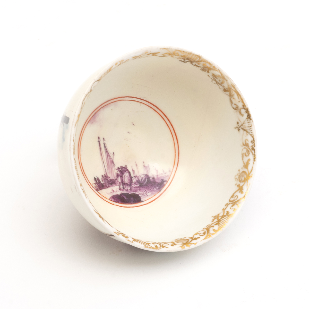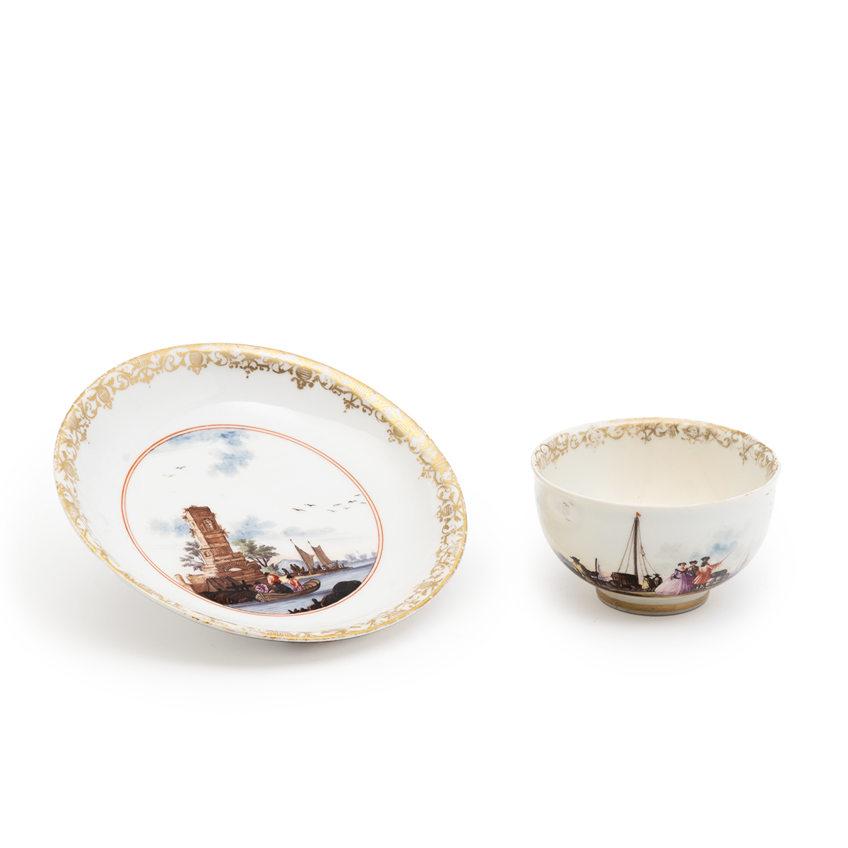 The bowl and saucer both painted with nautical motifs including a port scene around the body of the bowl parcel gilt foliate motif to rims.