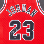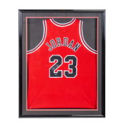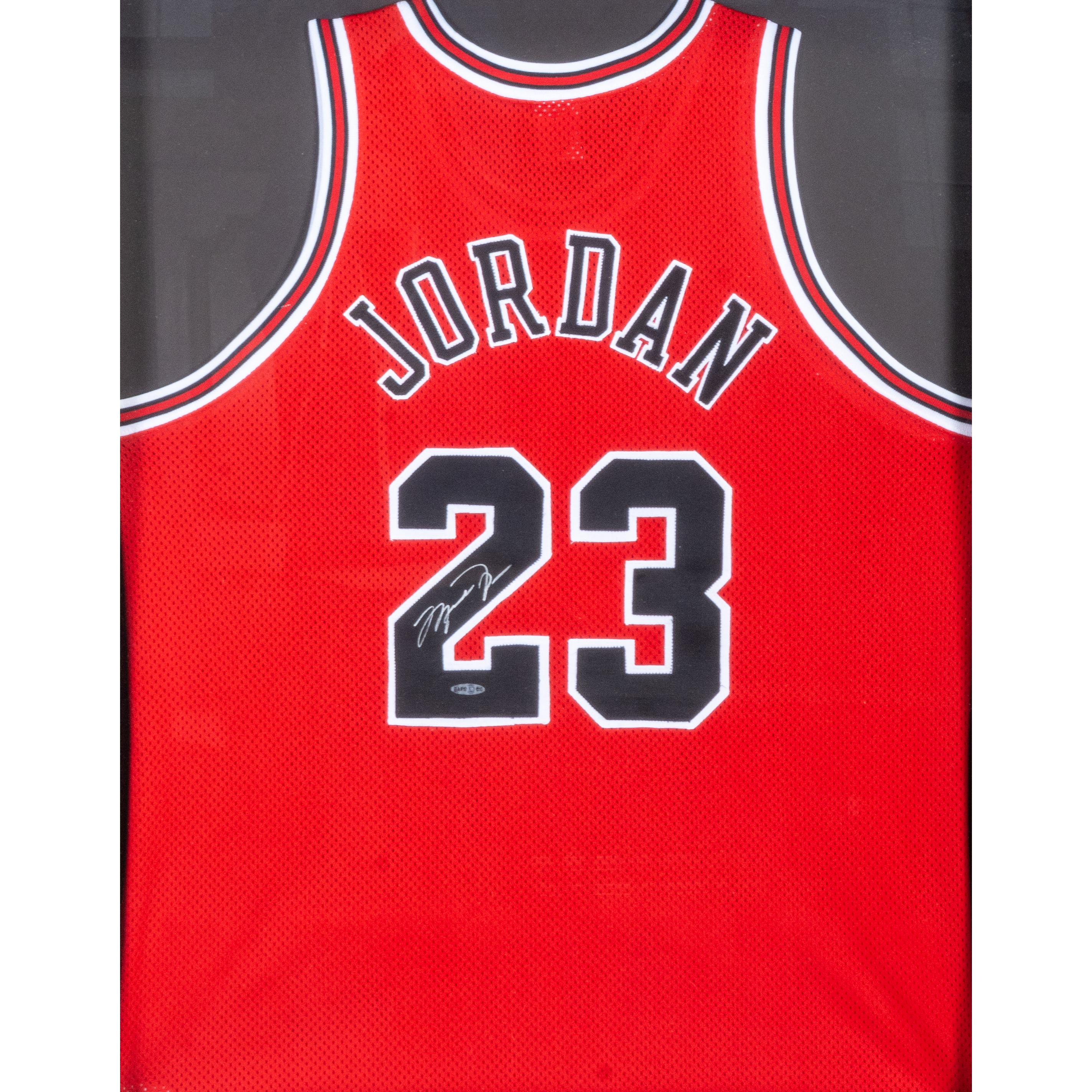 Red Chicago Bulls jersey signed with silver marker, in black frame signed in 1998 Michael Jordans basketball camp.