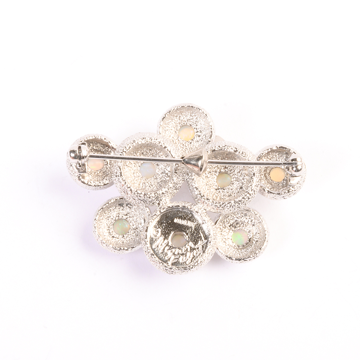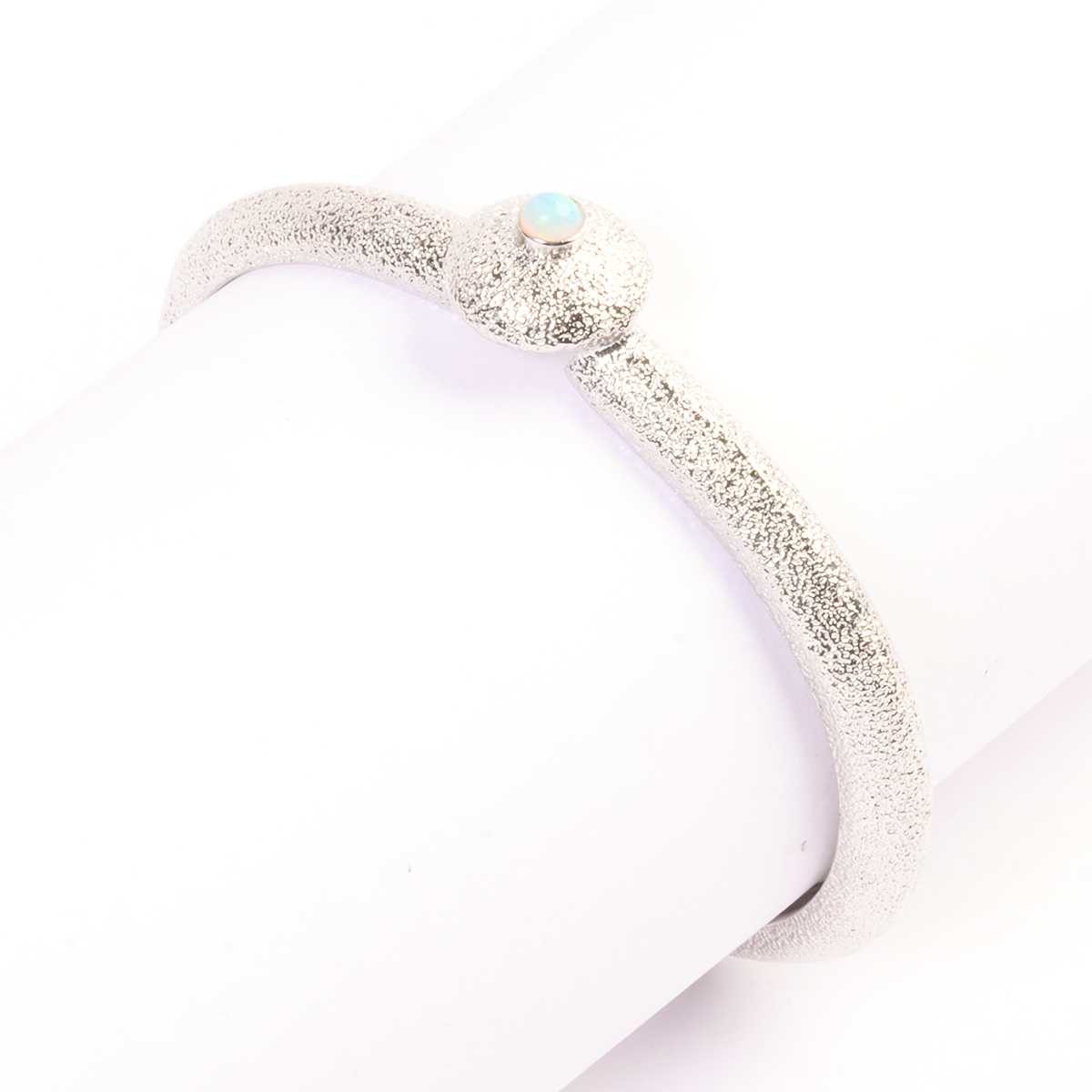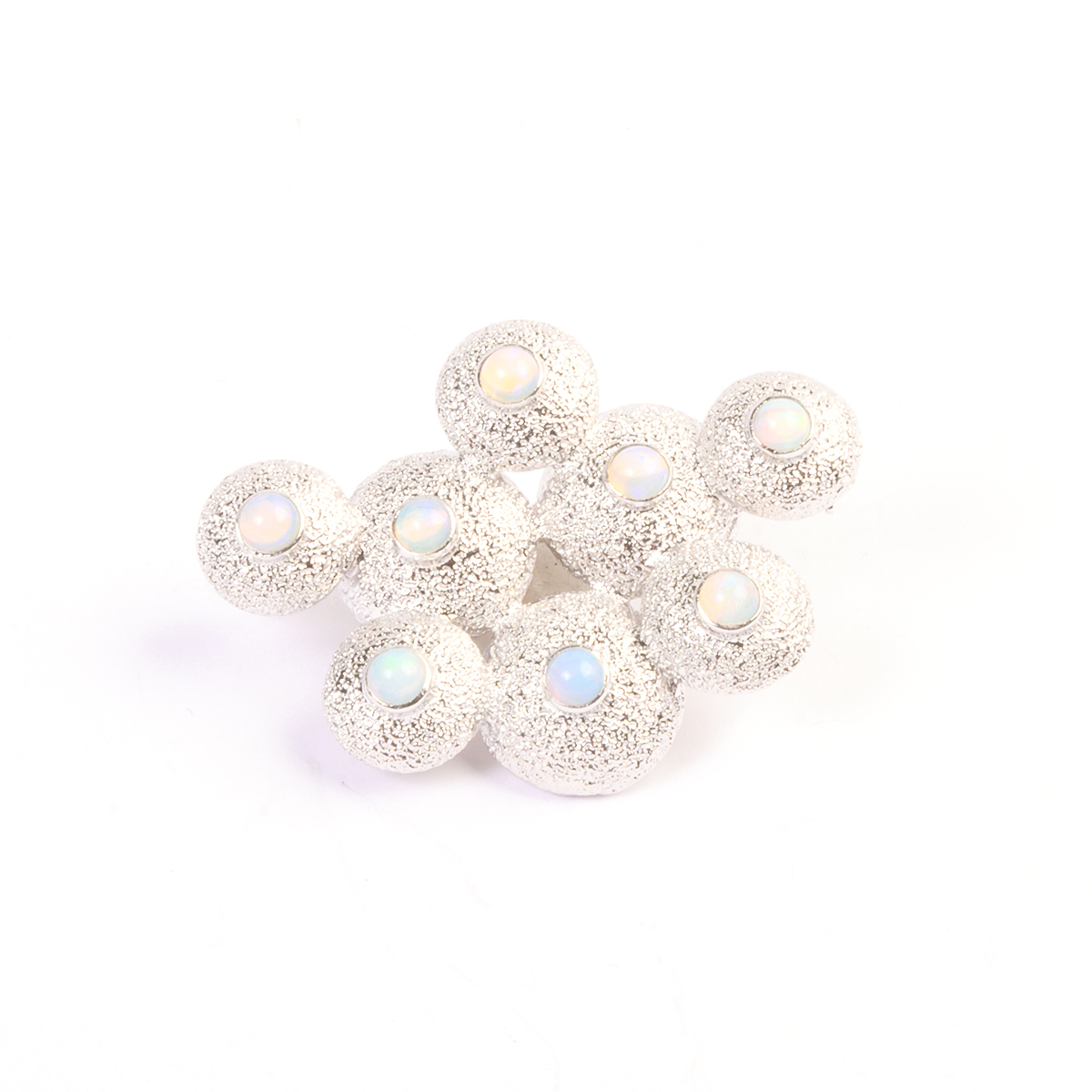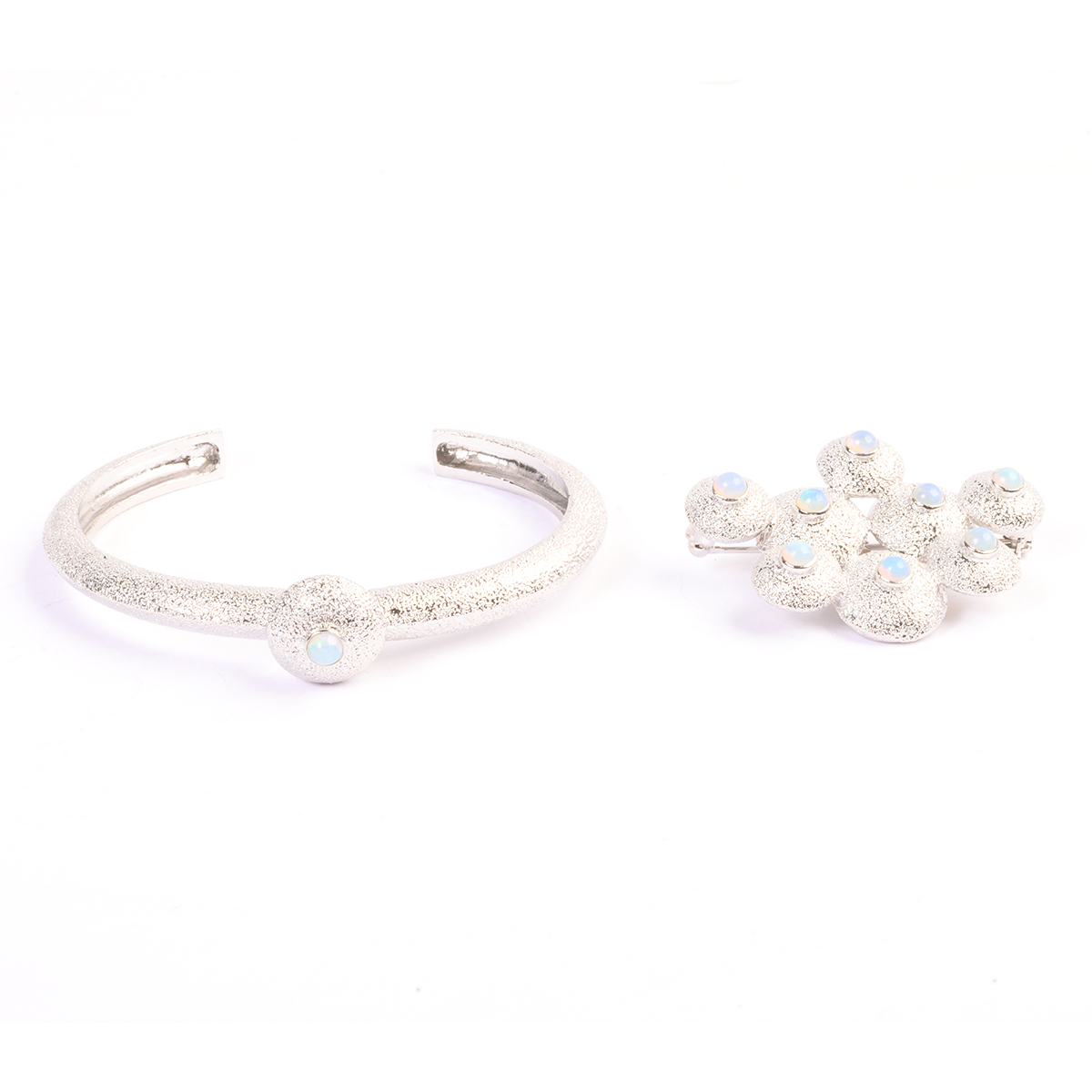 Including round shaped opal cabochon, textured sterling silver brooch measuring approximately 32 x 43 mm together with a matching round shaped opal cabochon, textured sterling silver cuff bracelet with an internal diameter of approximately 57 mm.