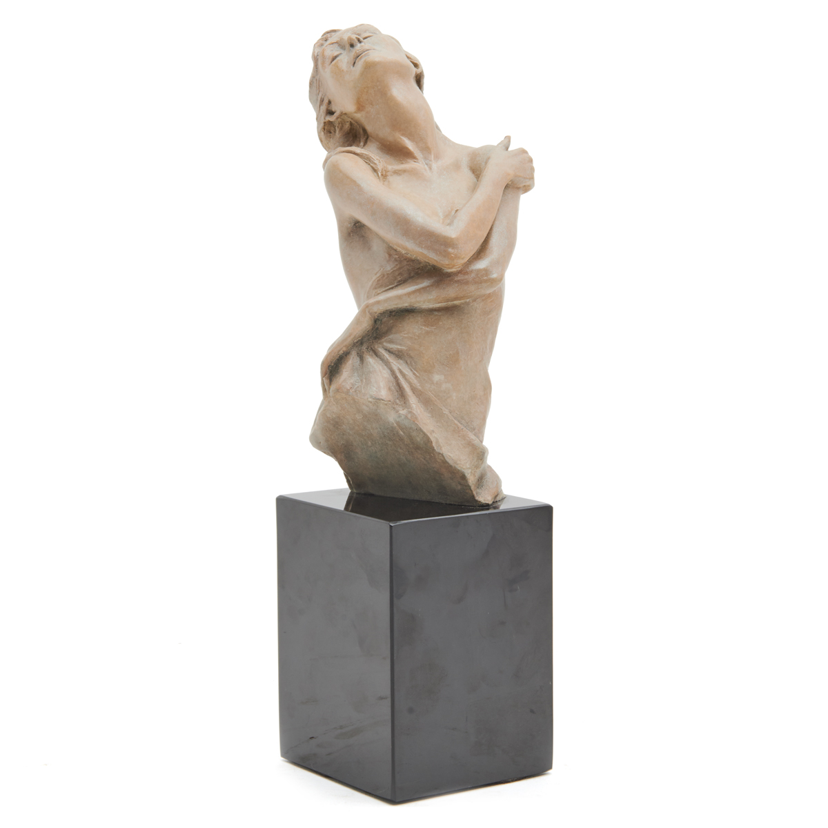 Notes: Base shows wear, approximate dimensions - base: 4-1/8 H x 3 W x 3 D inches. Bio: The sculptor studied painting at the University of CA, Berkeley. Travels in Italy and France influence her work, and in 1995 she shifts the attention of her work to sculpture. Within several years she exhibits at several significant venues - The Chamizal National Memorial in El Paso, TX and at The National Sculpture Society Awards Exhibit in Brooklyn Gardens. Her work is in both corporate and private collections, including the Texas Protective Life Insurance Co., the Ramada Corp., Mousa Enterprises, among others.
