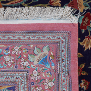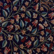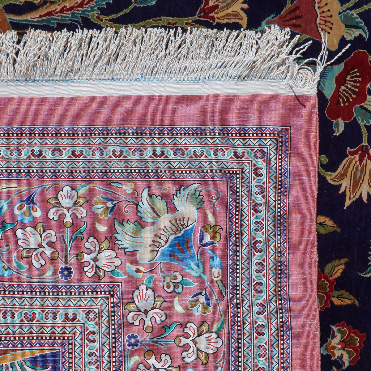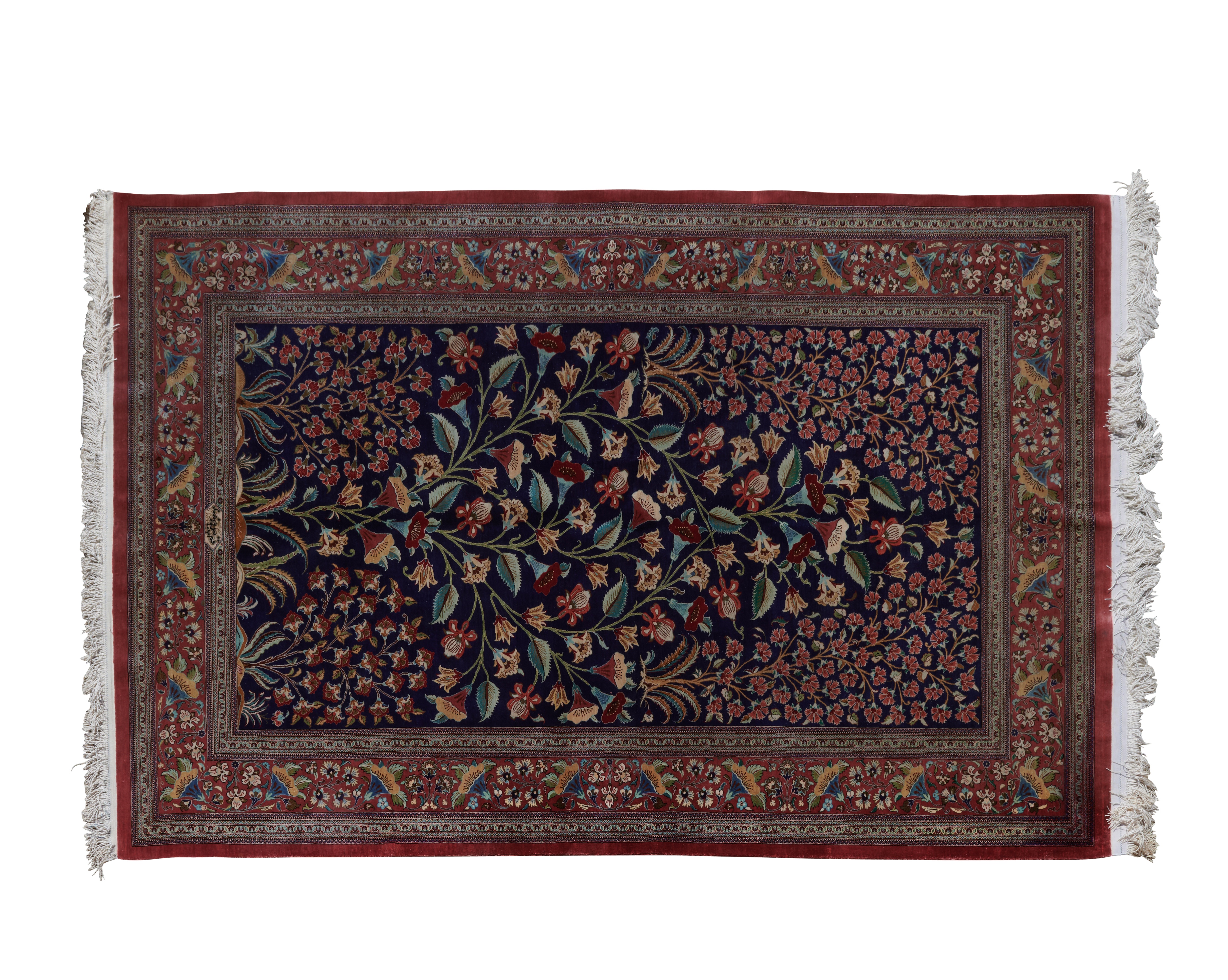 Floral motif on blue ground, red main border with multi-tiered guards, inscription to one end.