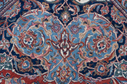 Bright red field centering a quadruple foliate medallion, woven throughout with vibrant floral designs, the corners with stylized poppies and iris reserved on medium blue ground, quadruple band guard border with scrolling flowerhead design.
