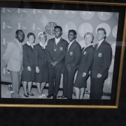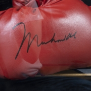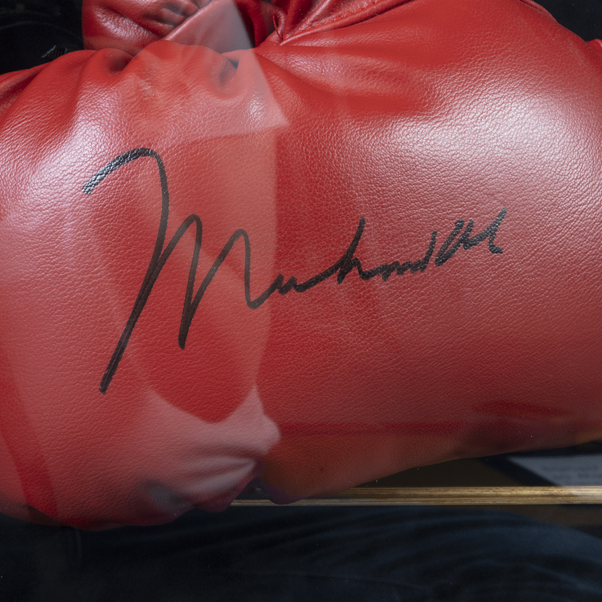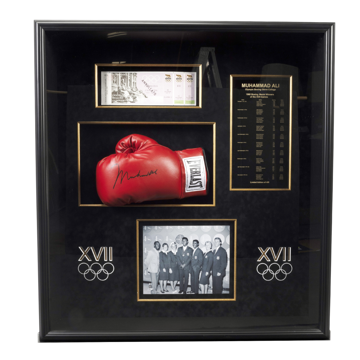 Various items in shadowbox frame comprising a XVII Olimpiade Roma 1960 ticket, red Everlast glove with Muhammad Ali signature, list of 1960 boxing medal winners of the XVII games, and photo of Ali with others.